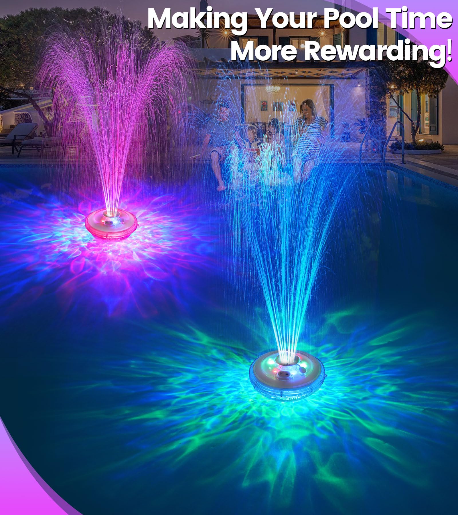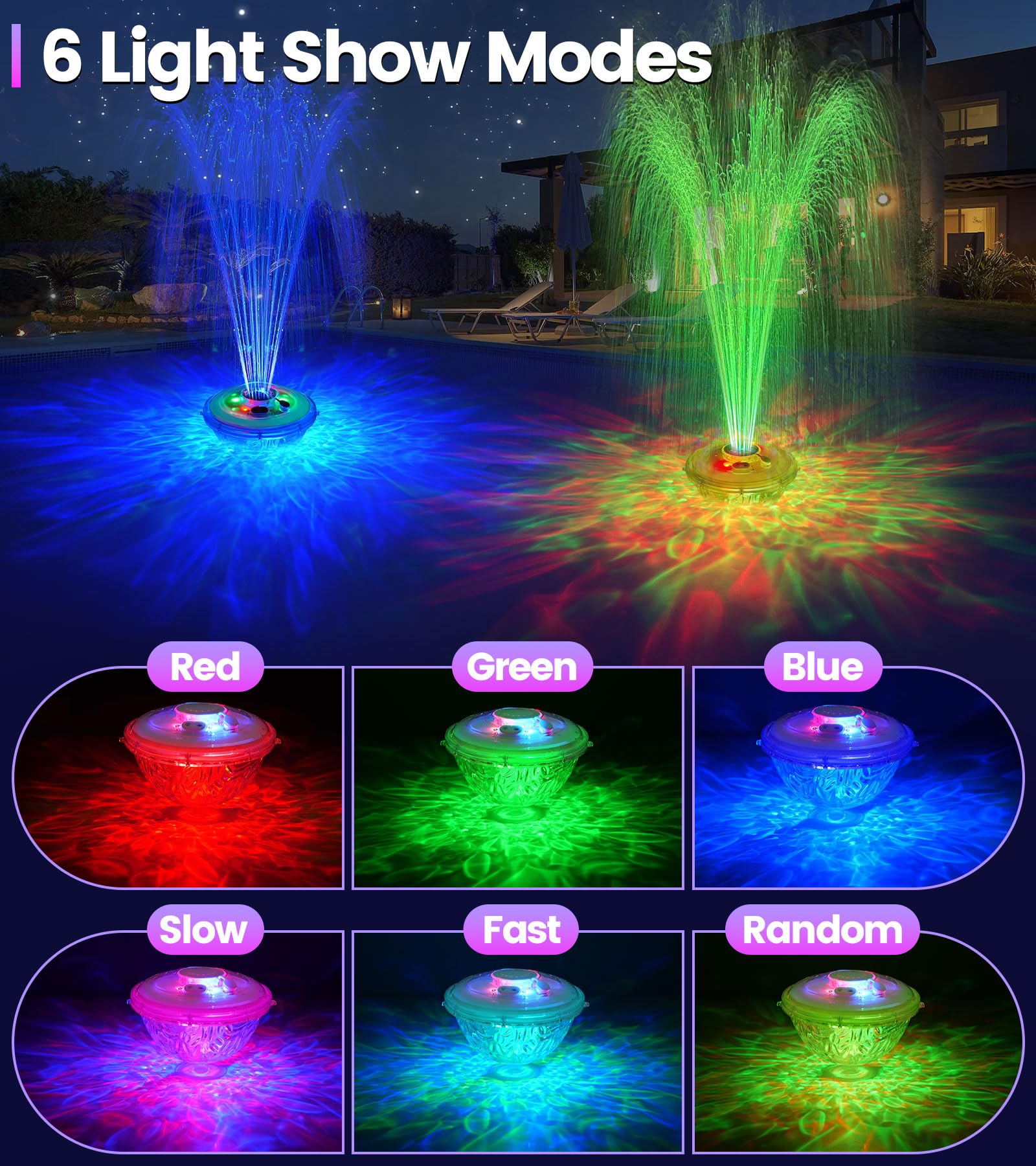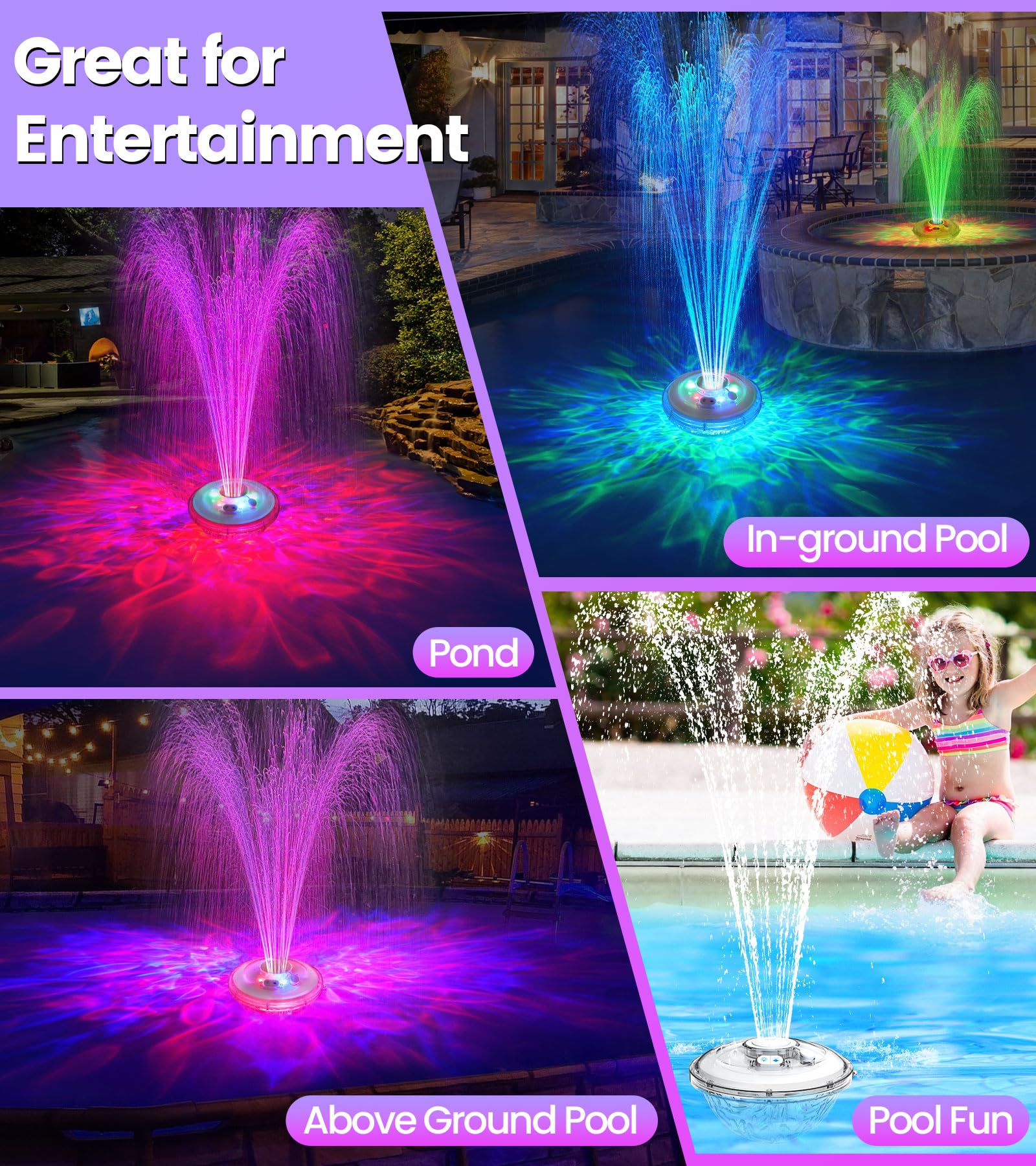 FOUNTAIN LIGHTING SHOW: From flickering neon to dreamy gradients, LanAqua floating pool fountain with 6 lighting modes turns your pool into the most eye-catching focus. At nightfall, the pool fountain lights up not only the pool, but also the water spray, creating a simply mesmerizing scene, as if you were in a fairy tale world! You and your family can enjoy the wonderful light show, which adds a touch of elegance to your pool or pond