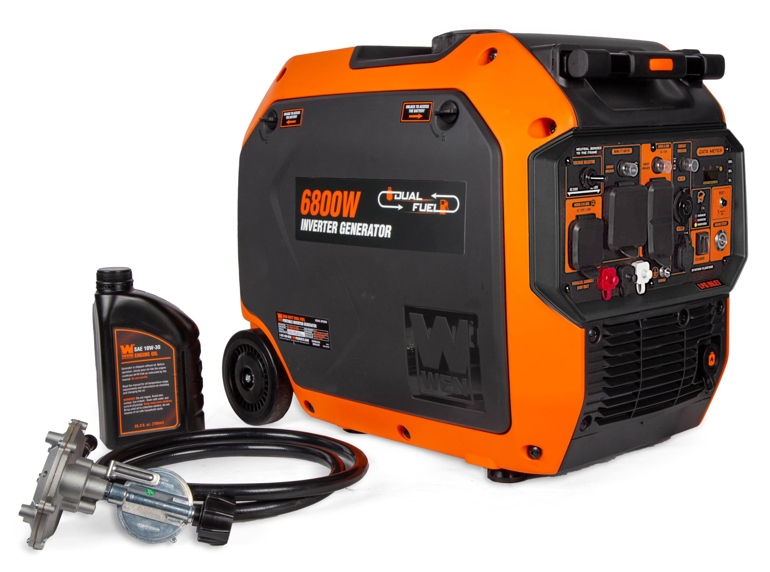 Remember when you had clean and quiet portable power? The WEN 6800-Watt Inverter Generator provides clean energy, free of voltage spikes and drops, without all the noise of a regular generator. Produce up to 6800 surge watts and 5100 rated watts of power on gasoline, or connect a propane tank using the tool-free quick-connector for up to 6000 surge watts and 4500 rated watts of power on LPG. The keyless electric start lets you turn on your generator at the press of a button, and includes a recoil starter as backup. The WEN Watchdog CO Shutdown Sensor helps protect both you and your family by automatically turning off the generator if dangerous levels of carbon monoxide are detected. Our 224cc engine operates at a modest 64 decibels at quarter load. This limits its invasiveness while camping, hunting, tailgating, and restoring backup power. The WEN 6800W Inverter Generator is also equipped with fuel shutoff. This feature turns off the flow of fuel, allowing for the generator to use up the remaining fuel from the carburetor before automatically shutting down. This helps fight the build-up and blockages caused by stagnant fuel inside of the carburetor, minimizing maintenance while prolonging the unit’s lifespan. Designed to mirror a pure sine wave, this generator limits total harmonic distortion to under 0.3 percent at no load and under 1.2 percent at full load, making it safe to run laptops, cellphones, monitors, tablets and other sensitive electronics. The built-in wheels and telescoping handle make for easy portability while the ultra-efficient 2.9-gallon tank provides up to 6.1 hours of half-load run time (or 9 hours half-load run time on a 20-pound LPG tank). The fully-packed panel comes equipped with one 120V/240V NEMA transfer-switch or electric-vehicle-ready L14-30R receptacle, two three-prong 120V NEMA 5-20R receptacles, one 12V DC receptacle, one 120V TT-30R RV receptacle, a voltage selector switch, and two 5V USB ports. Maximize fuel economy by engaging the eco-mode switch. This allows the generator's engine to automatically adjust its fuel consumption as items are plugged into and unplugged from the panel, preventing the unnecessary usage of gasoline. Need more energy? Easily link up any two 240V WEN inverter generators using a WEN 240V Parallel Connection Kit (sold separately) in order to share wattage amongst multiple units. Low-oil and low-fuel automatic shutdown combine with the built-in overload protection and indicator lights to safeguard both your generator and your electronics from damage. The bonded-neutral 240V configuration provides low-power Level 2 battery EV charging for peace of mind when your electric vehicle is off the grid. And because this is a WEN Product, your inverter generator comes backed by a 3-year limited warranty, a nationwide network of skilled service technicians, and a friendly customer helpline. Remember when your generator powered your electronics safely and quietly? Remember WEN.