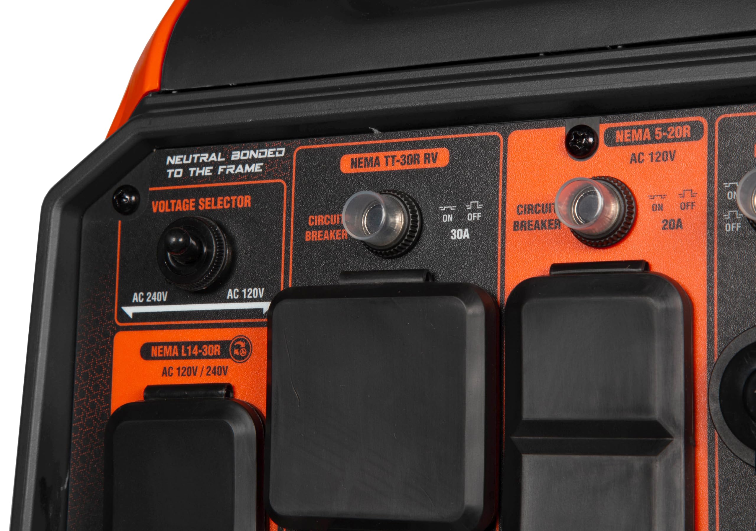 Includes fuel shut-off to help limit maintenance, onboard wheels, a telescoping pull handle, one L14-30R 120V/240V receptacle, two three-prong 120V receptacles, one TT-30R RV receptacle, one 12V DC receptacle, two 5V USB ports, a voltage selector switch, a tool-free LPG quick-connector, a six-foot-long LPG regulator hose, and a three-year warranty