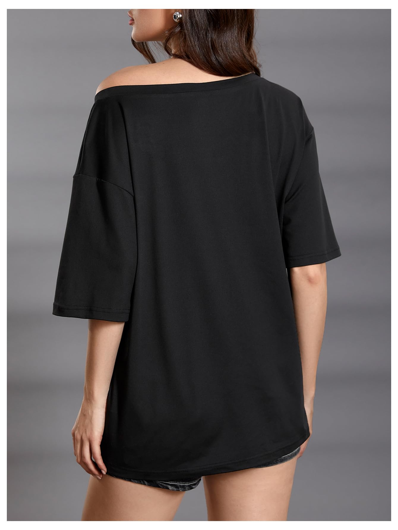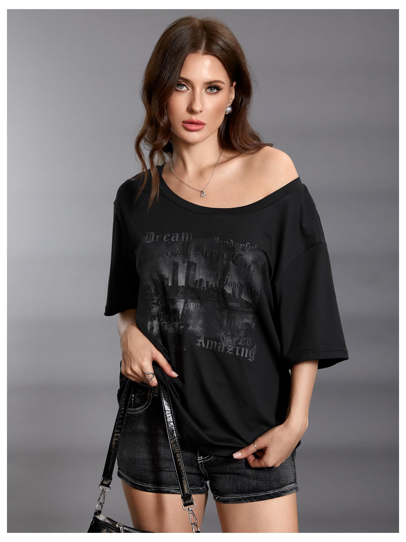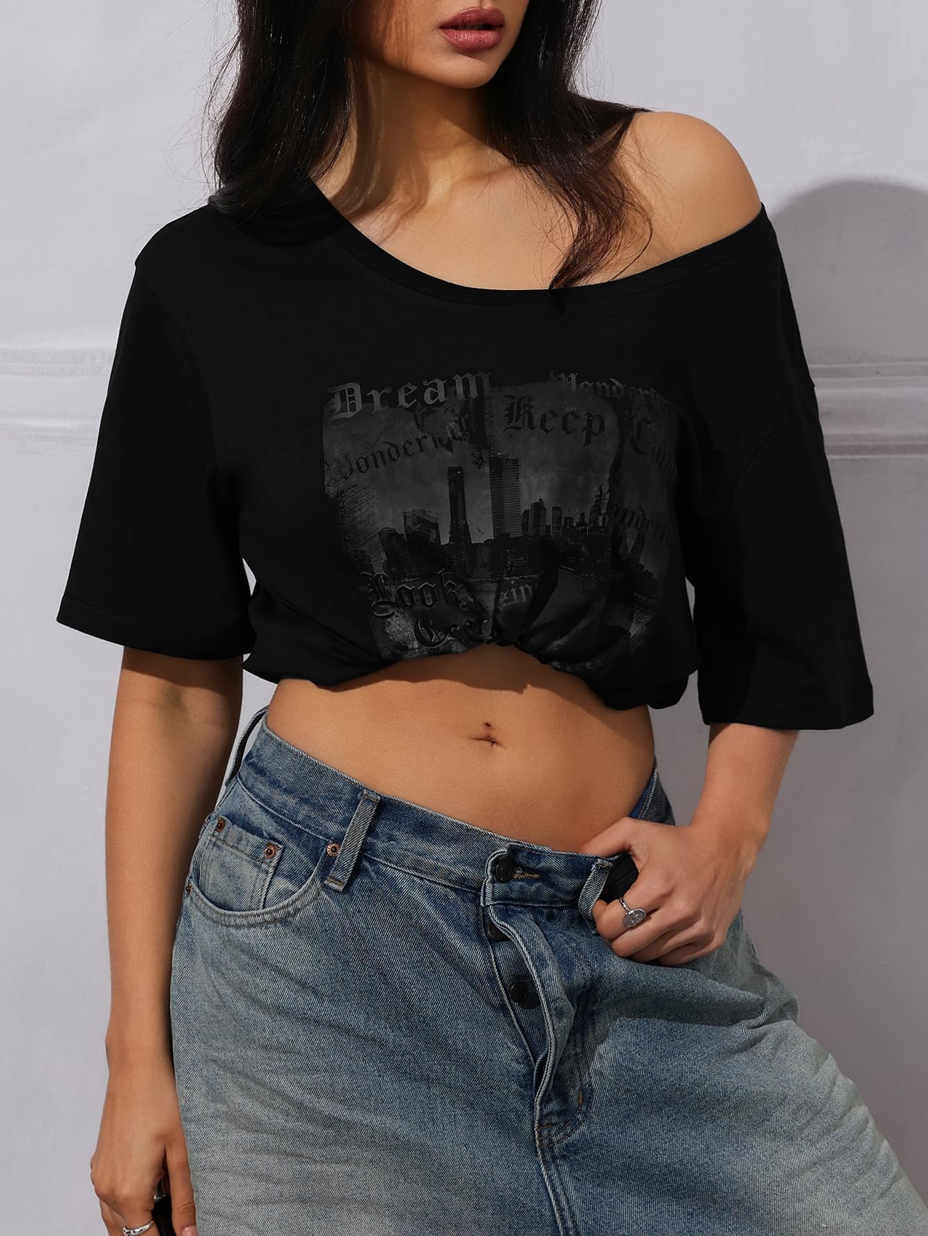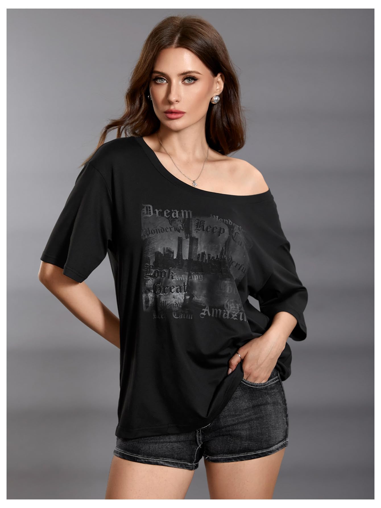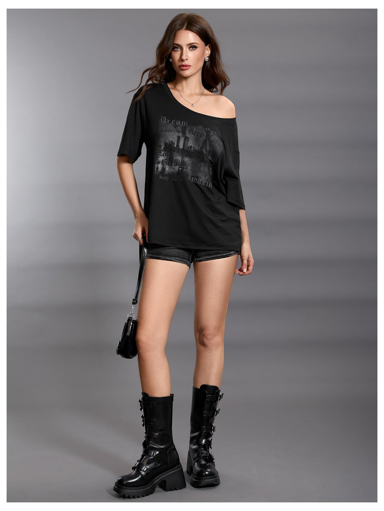 Features: graphic print, halfsleeve, boat neck, drop shoulder, goth tee shirts, y2k trendy tee tops