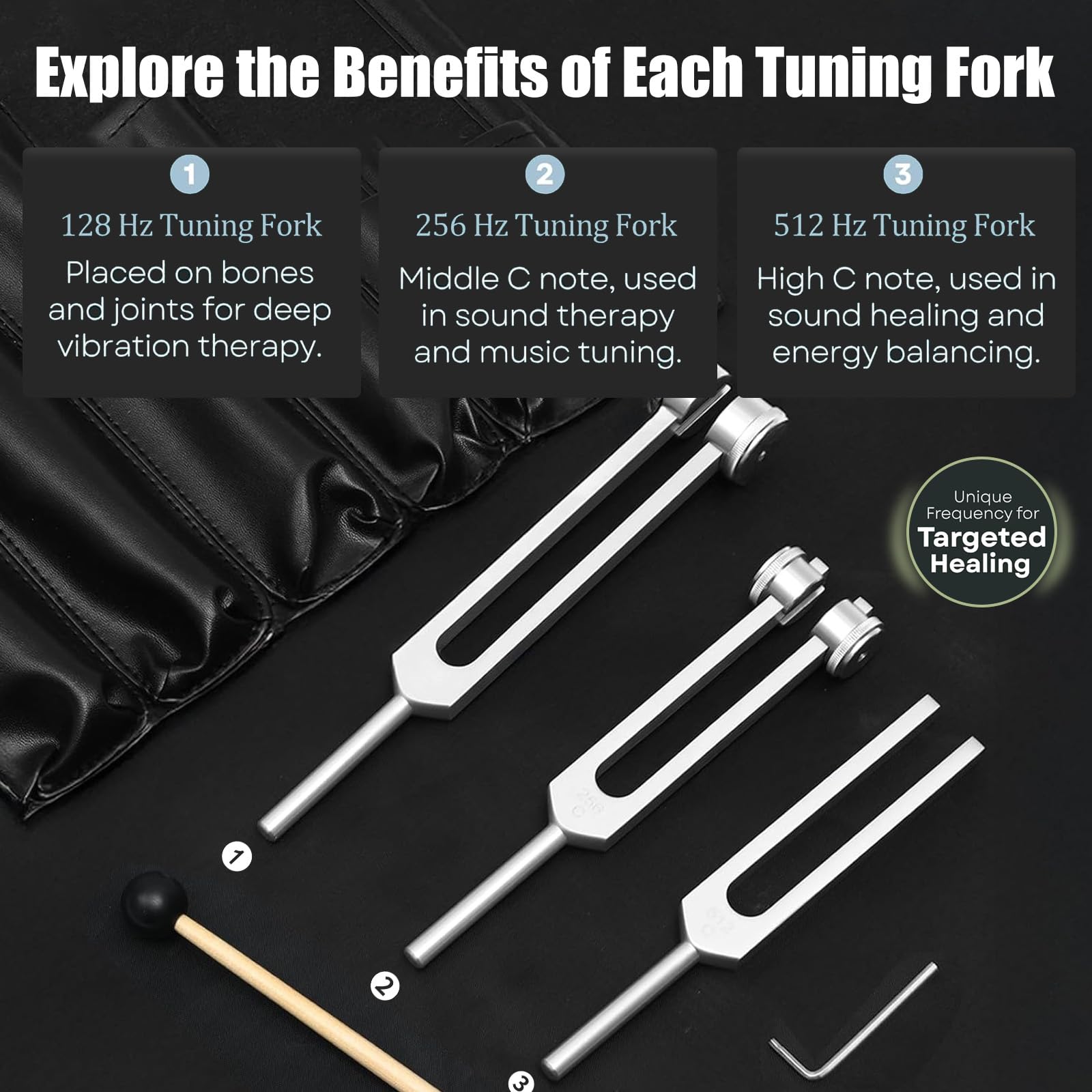 【Help with Relaxation】Tuning-forks for healing utilizes precise frequencies such as 128Hz/256Hz/512Hz to clear energy centers, reduce stress and anxiety, balance emotions through targeted vibrations, support physical and mental health, and facilitate deep relaxation and inner growth.
