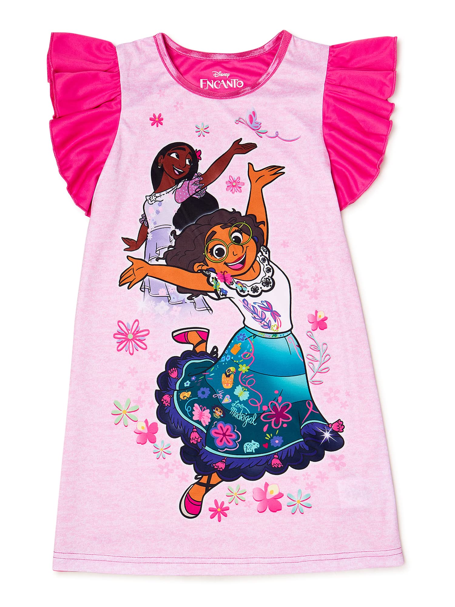 DETAILED CHARACTER DESIGN - Adorable pink Disney Encanto nightgown with short ruffled sleeves and crew neck. Features Maribel and Luisa dancing and bonding on a vivid and colorful print.