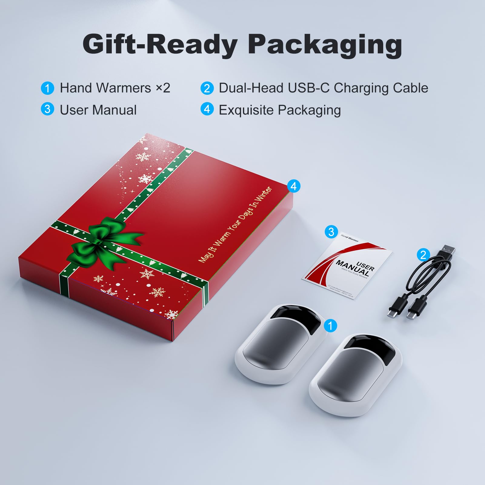 Long Battery Life & Quick Recharge – Each electric hand warmer has a 3200mAh battery lasting 8–12 hours (tested at room temperature) and recharges fully in only 4 hours. Whether for winter camping essentials, hiking, or daily commuting, these hand warmers reusable keep you powered through the cold