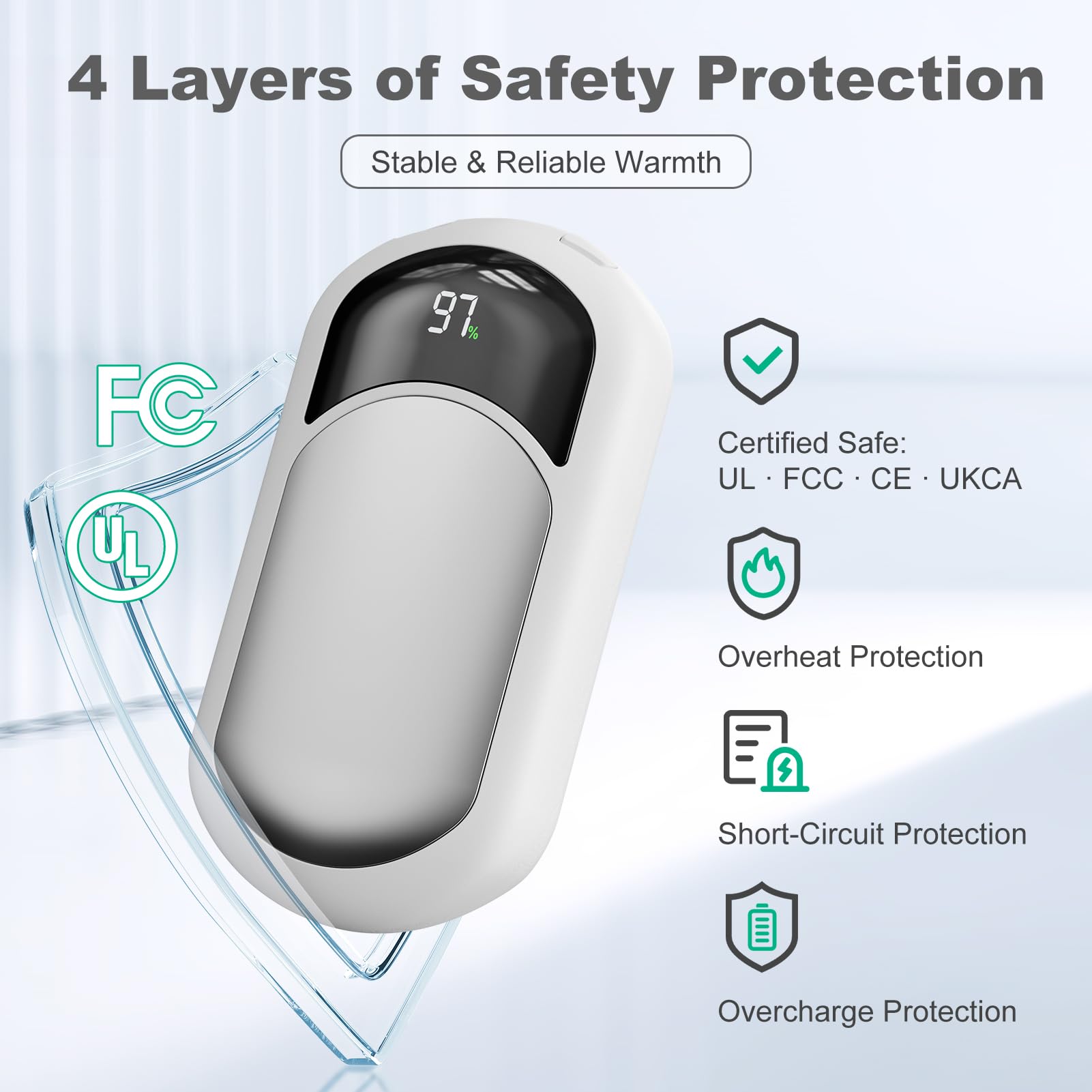 Stable & Reliable Warmth – These hand warmers rechargeable are built with UL, FCC, CE, and UKCA certifications, plus overheating, overcharge, and short-circuit protection. You can enjoy steady warmth without worry, making them dependable electric hand warmers rechargeable for daily use or outdoor activities