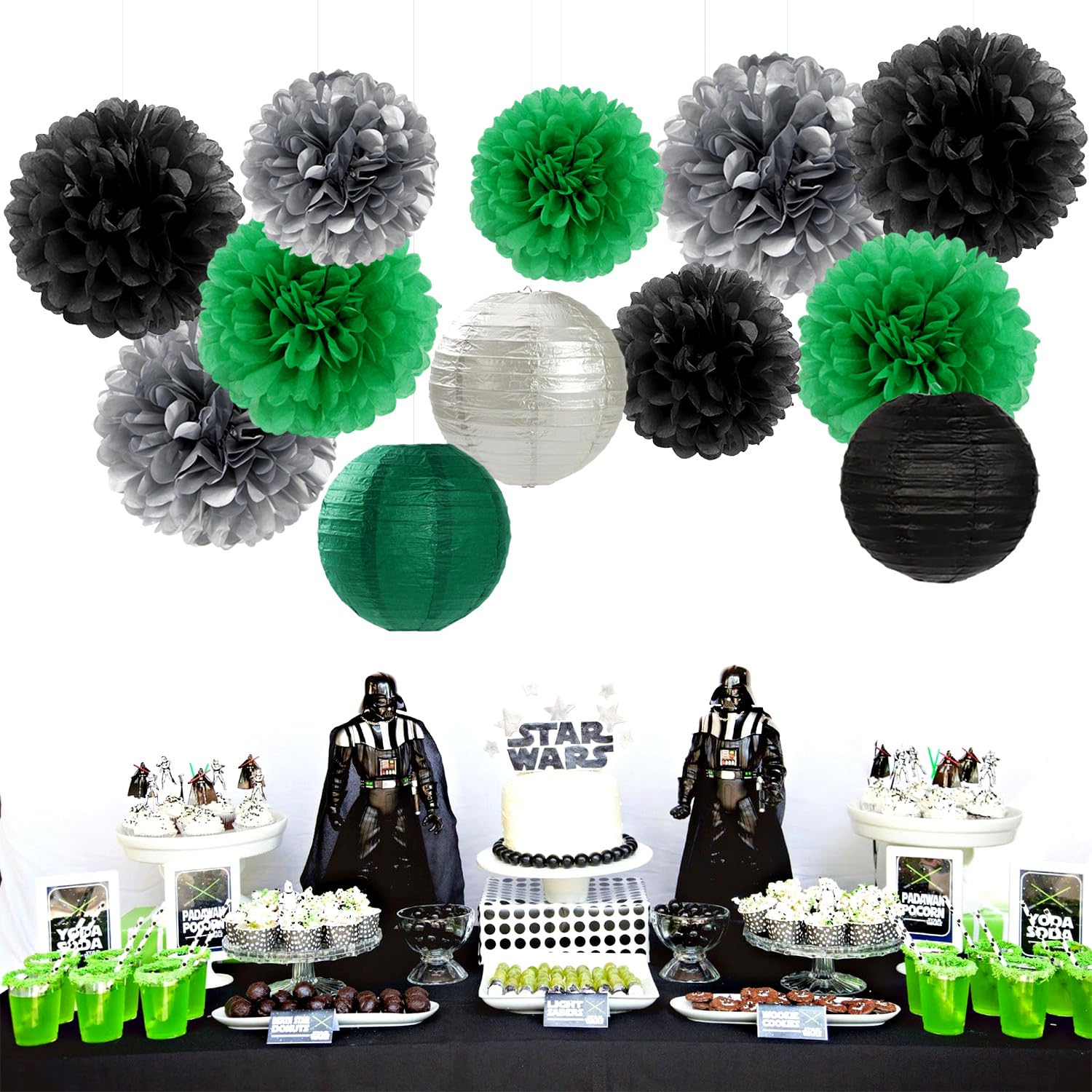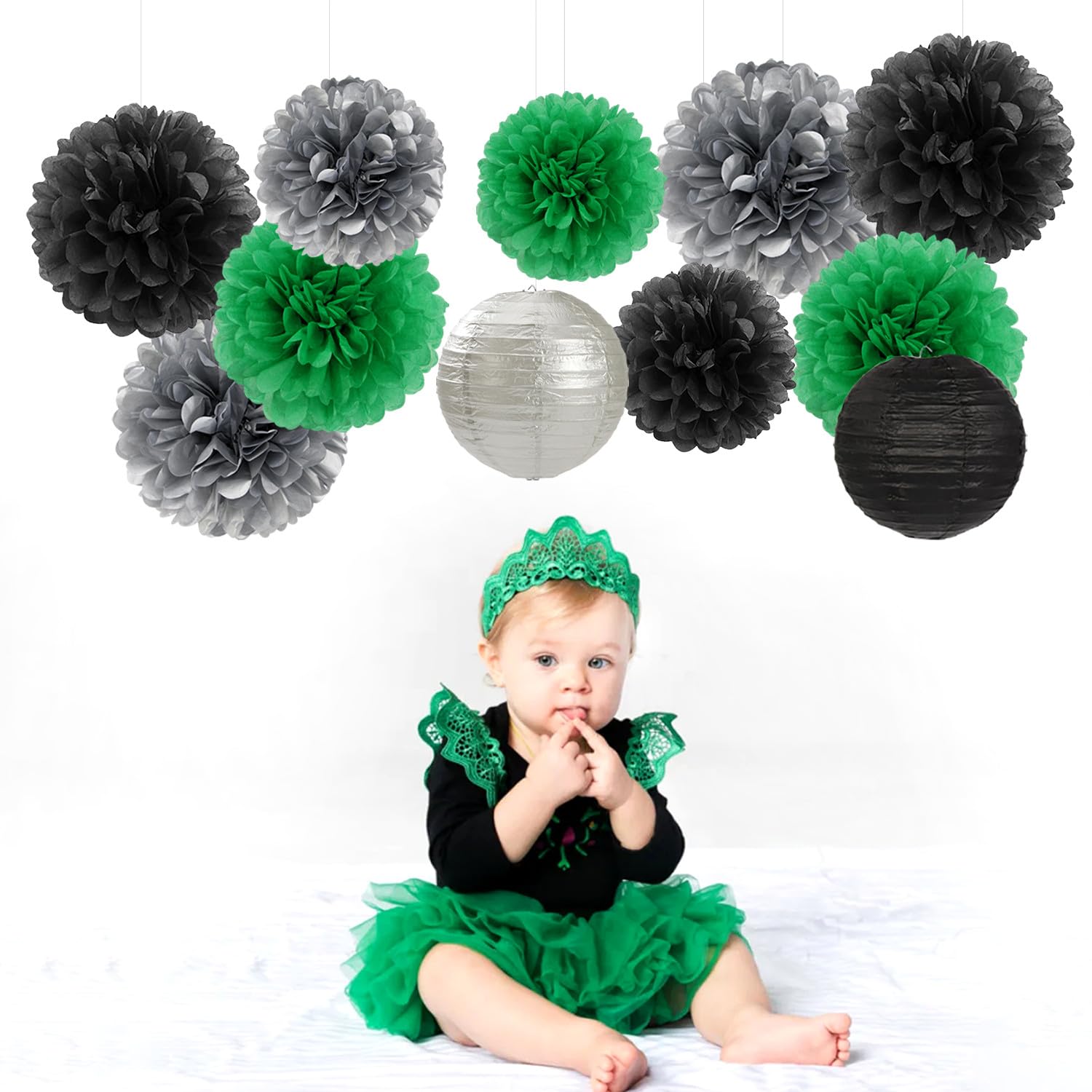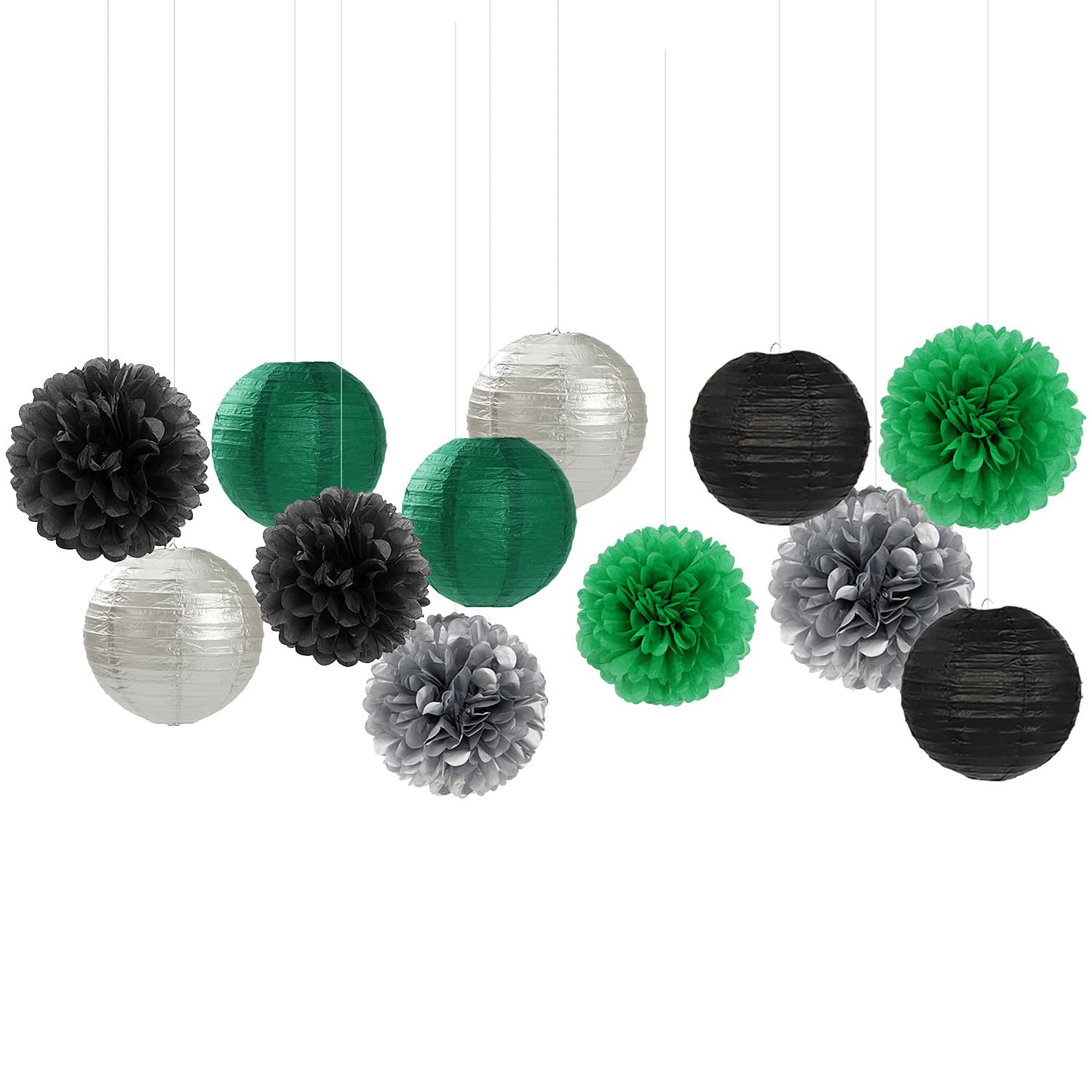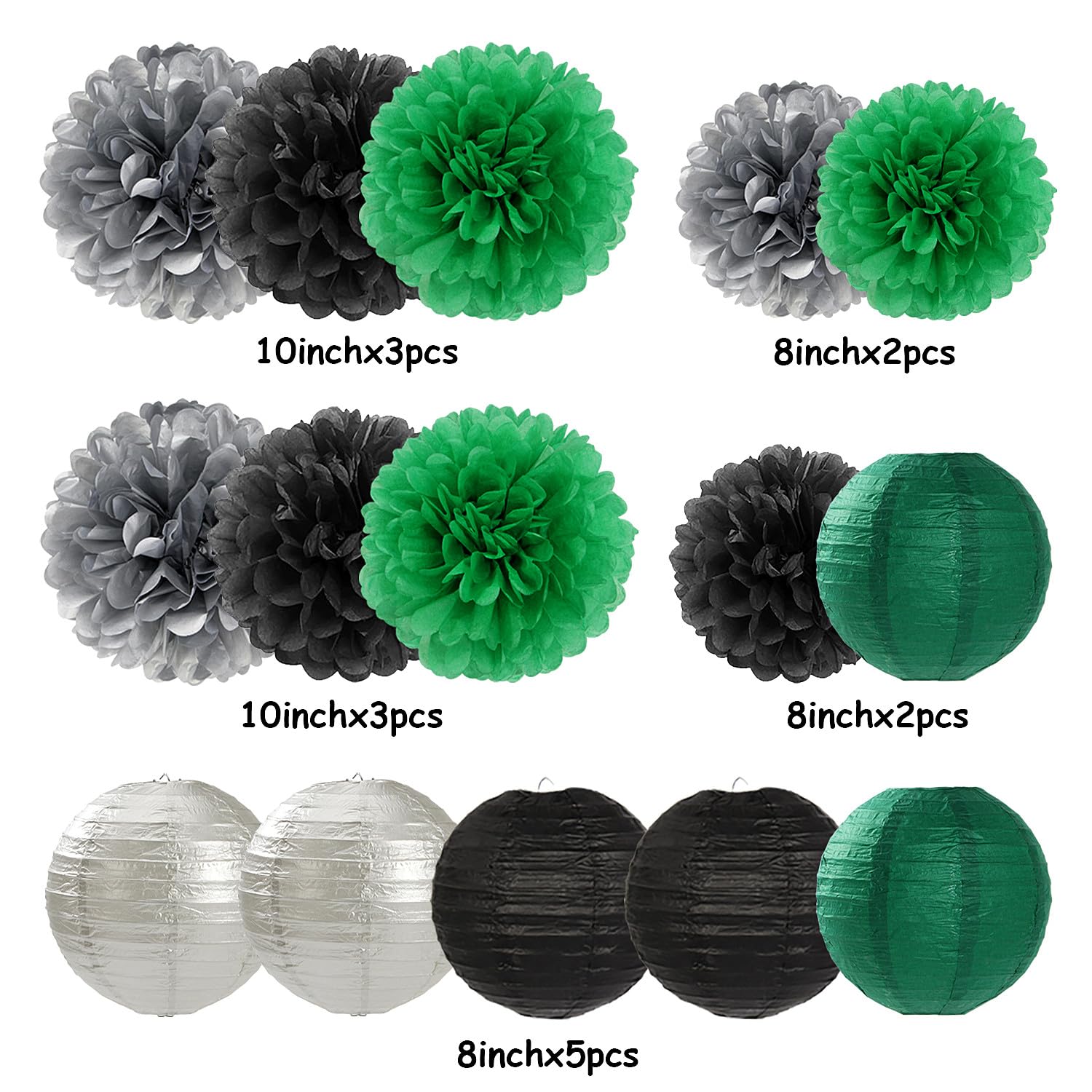 【Green Black Silver Party Decorations Kit Includes】The party decorations kits include 9pcs tissue paper flowers: 6pcs 10" and 3pcs 8" in dark green black silver color, 6pcs 8inch paper lanterns.