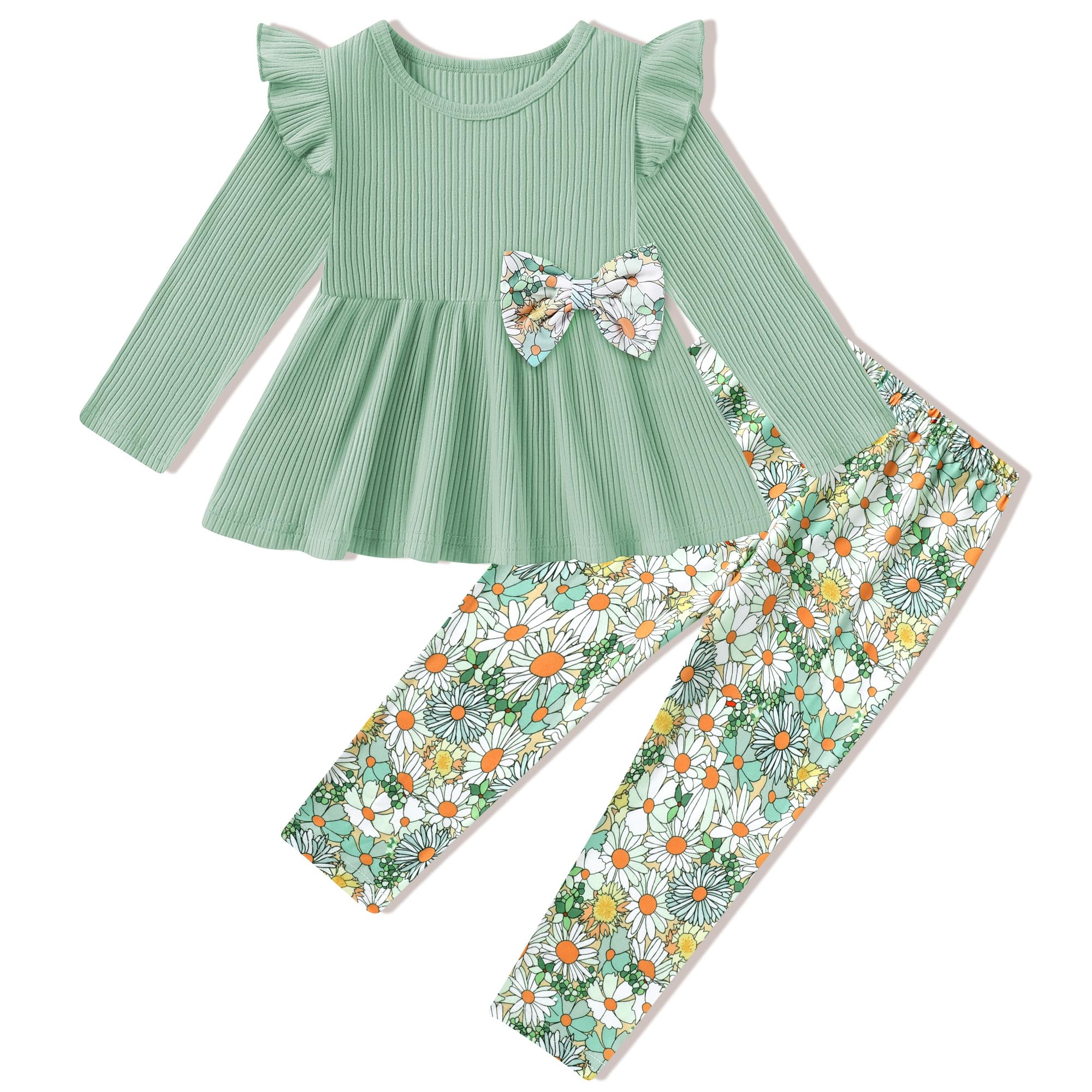 Packages:This toddler clothes for girls includes a solid color long sleeve top and a popular patterned pants;Machine washable
