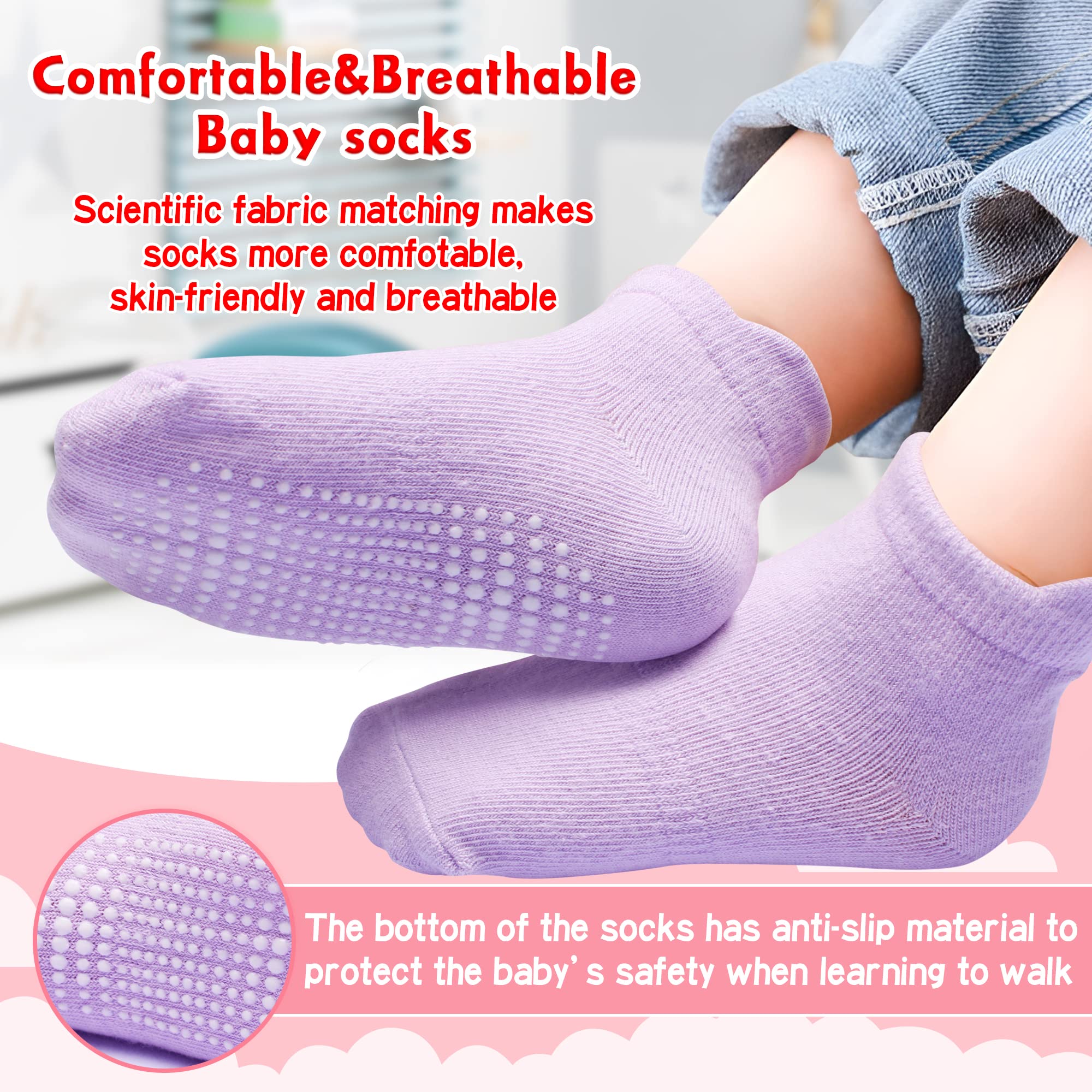 👣ANTI-SLIP BABY ANKLE SOCKS: These grip socks for girls with traction grips at the bottom covers the whole foot from heel to toe. The gripper dots for safe footing to prevent your kids from slipping on the smooth floor, wooden or tile floor. The pull tabs behind the ankle helps the mom to put on and take off the socks very easily.