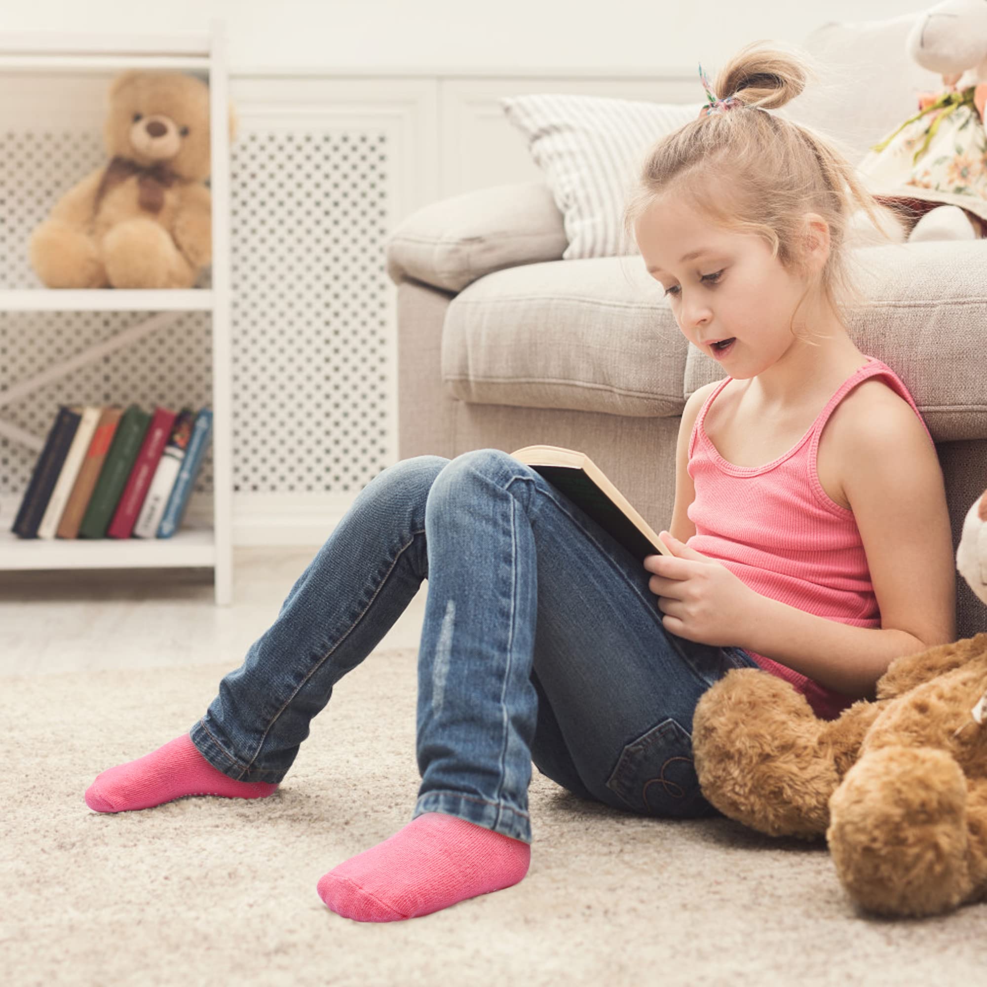 👣SKIN FRIENDLY COTTON : Cotton-rich fabric offering all day comfort, breathability and softness to baby`s foot. Stretchy material provides a good fit to grow with your child. Medium thickness makes these toddler gripper socks suitable for all seasons. Less shrinkage or pilling and no fading after wash meaning you buy less. Seamless toe, good elastic, absorb sweat, breathable, odor resistant.