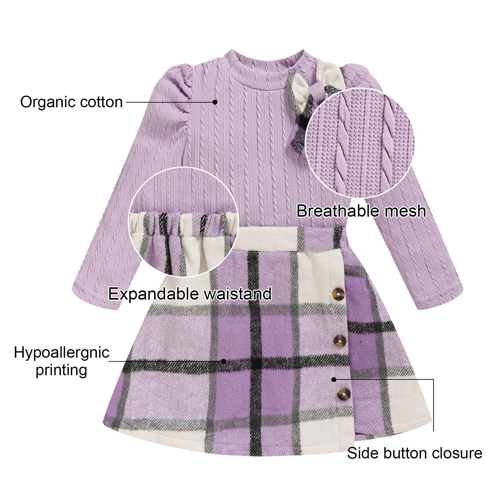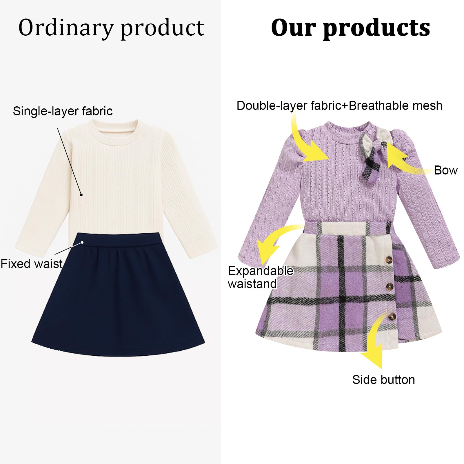 MATERIAL: Toddler girl shirt sweater top is made of cotton and polyester, bottom skirt is made of cotton blend and polyester, soft, breathble, and comfortable, sweet toddler baby girl 2 piece skirt set, cute baby girl clothes.