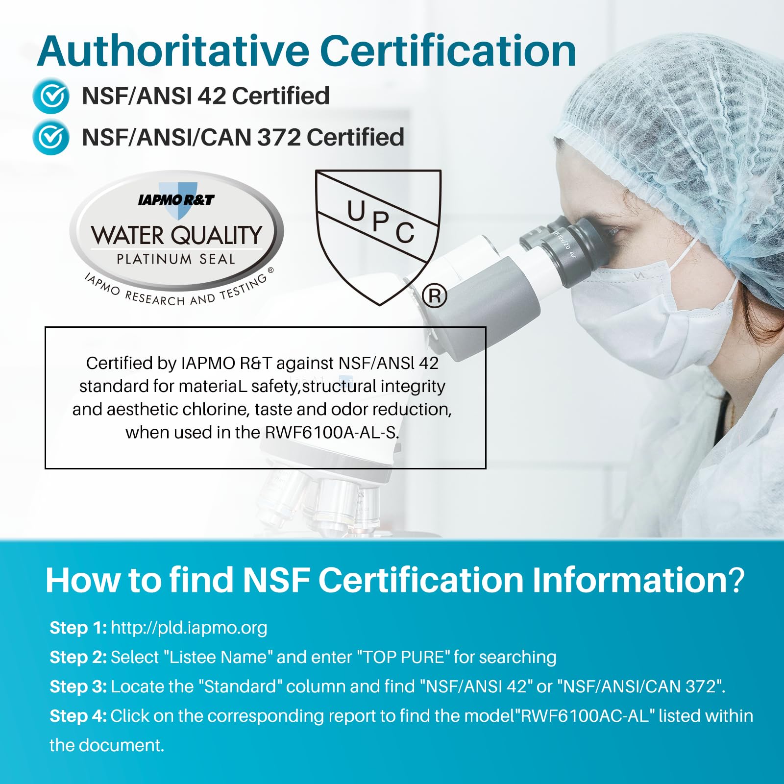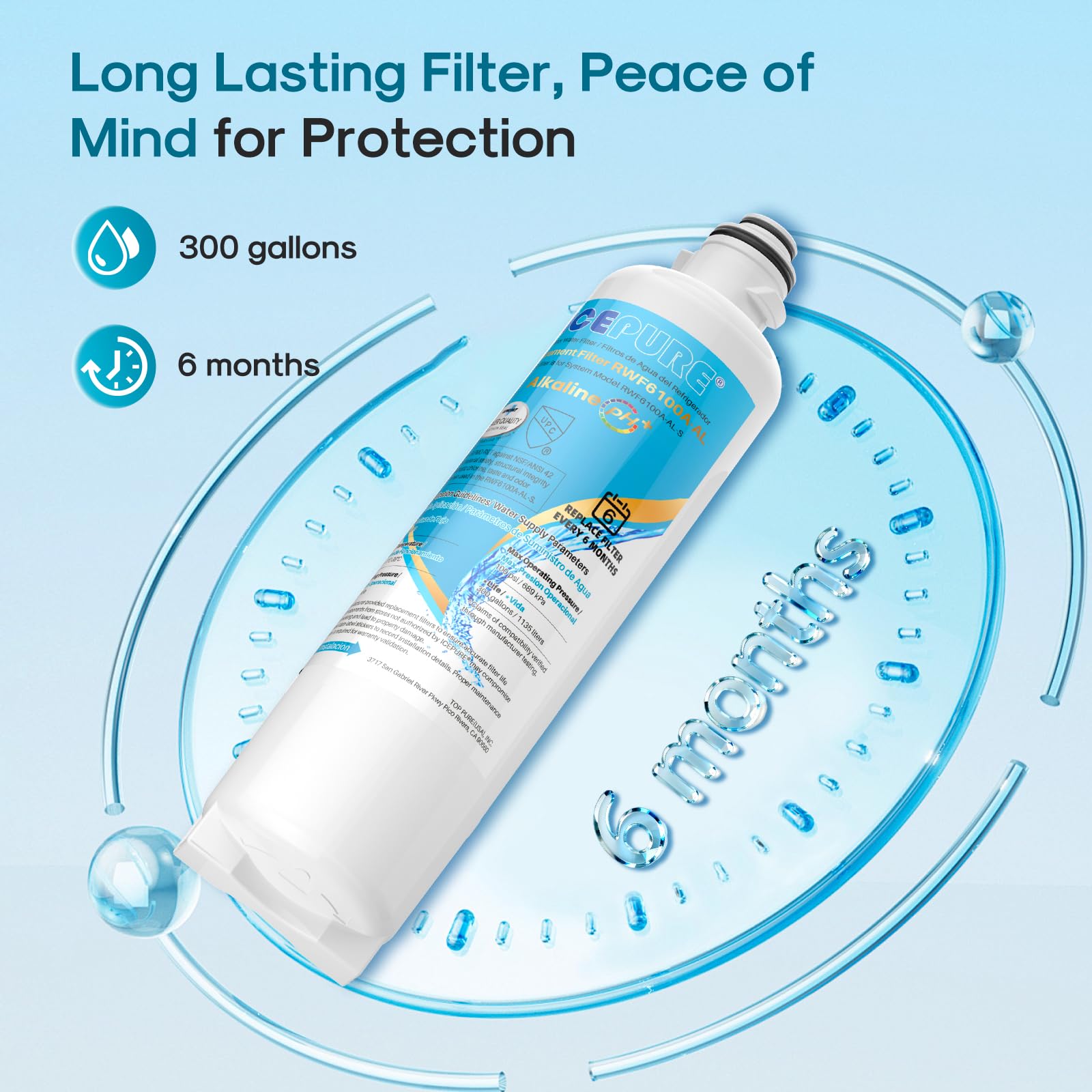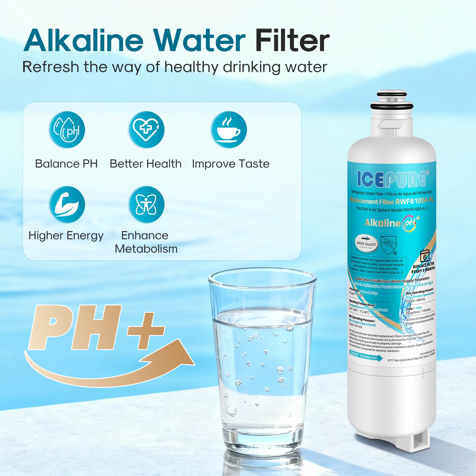 Authoritative Certification - The ICEPURE RWF6100A-AL alkaline water filter strictly adheres to international standards and has been certified by authoritative institutions, including NSF/ANSI 42 and NSF/ANSI/CAN 372 certification, European EC1935/2016, ROHS, REACH, BPA-Free, TUV, and Australian Water Mark. Each filtration performance has been professionally tested and verified to ensure the safety and reliability of the water output, providing high-quality drinking water for your family.