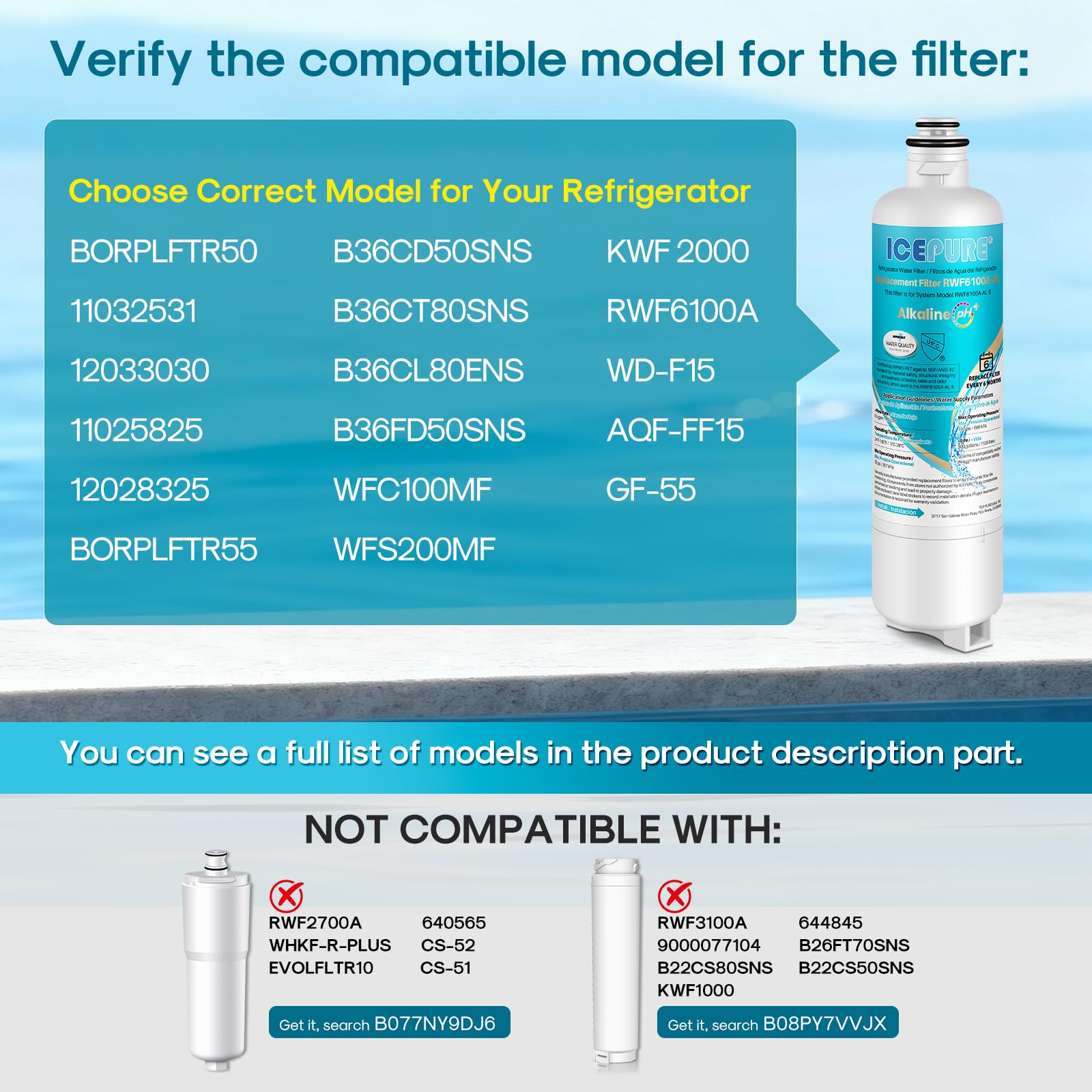 Compatible Model - 12033030, BORPLFTR50, BORPLFTR55, REPLFLTR55, RA450022, 12028325, 12036454, 11032531, 11025825, 17005582, 17005585, WFC100MF, WFS200MF, WFS210MF, B36CT80SNS, B36CT80SNB, B36CL80ENS, B36CL81ENG, B36CL80SNS, B36CD50SNB, B36CD50SNS, B36BT935NS, B20CS30SNS, B36IT905NP, B30BB935SS, B30IB905SP, B18IF905SP, 4961059, AP6989910, AP6991246, PD00067212, EAP16219157, PS16219157.