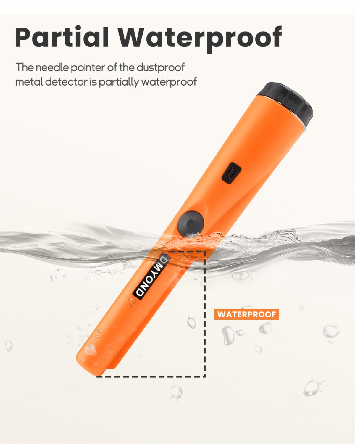 Partial Waterproof: The needle pointer of the dustproof metal detector is partially waterproof. You can sink this part into the water to check for metal in the water. But it can't be used in water, switches and horns are not waterproof