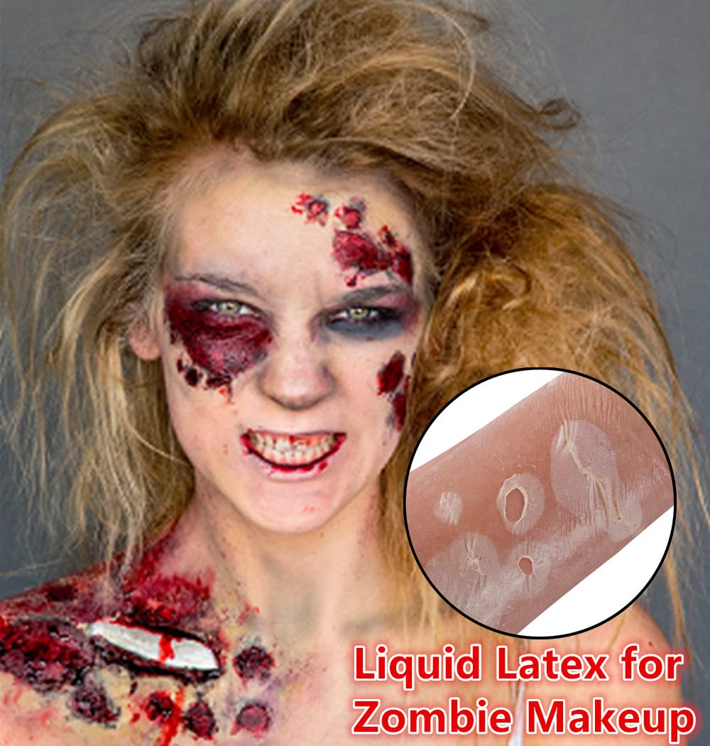 【Quick Drying Multi-Purpose Liquid for Halloween Zombie Makeup】Adhesive to attach things to the skin or seal wax,easy to use.Creating special effects like aged skin,peeling skin,cuts,wounds,scars,burns,blisters,wrinkles,stipples,blisters,bald cap.Used with fibres(like cotton or tissue) to creat 3D effects.Perfect for monster,zombie Halloween,cosplay,prosthetics makeup,costume makeup,fake scars makeup.