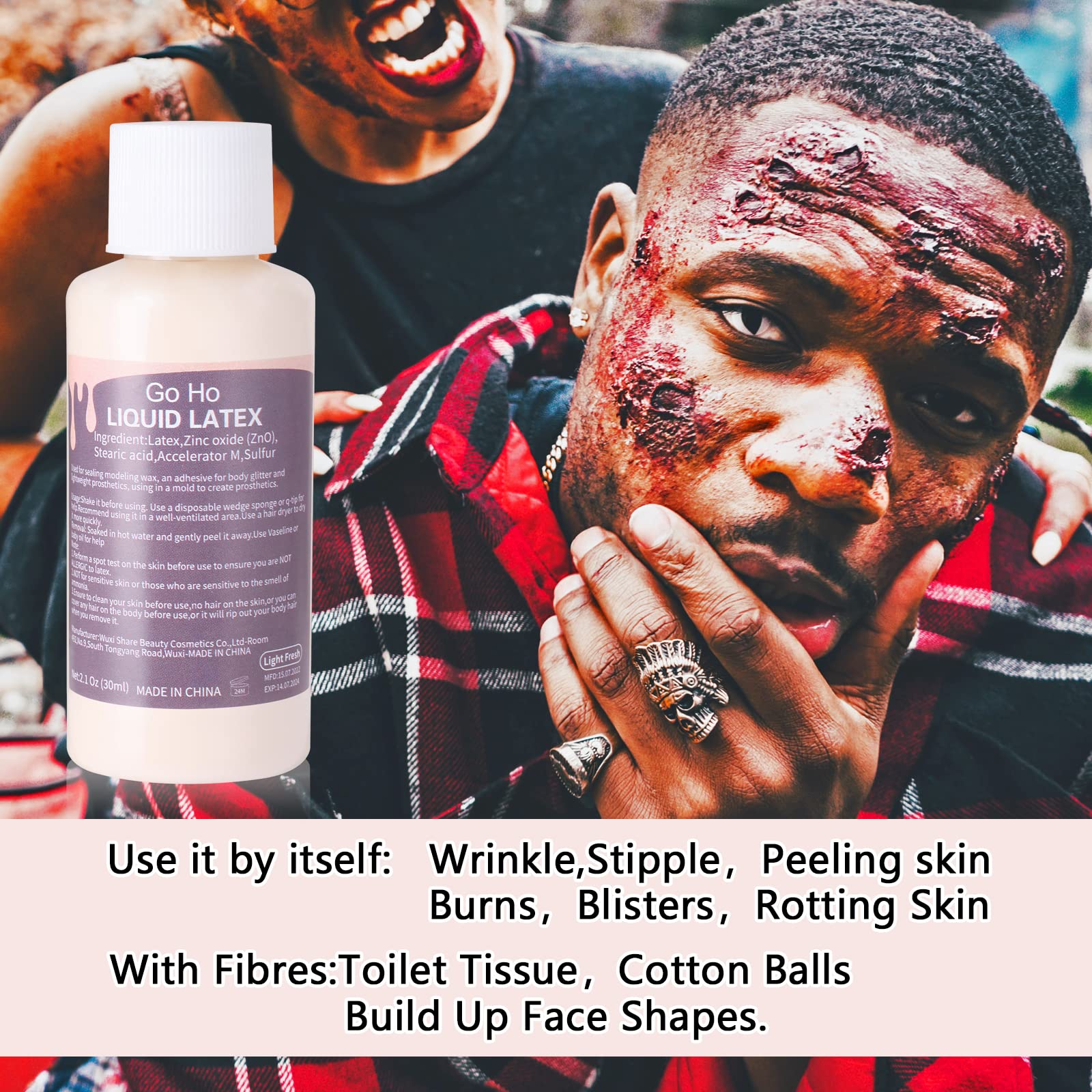 【1 oz Light Fresh Liquid Latex】Smooth and Stretched:Consistent and solid,not too watery or too dense.Stays in place for hours.Will not crack.Easily to get the most realistic looks.When it dried,it shrinks a little bit to create a second skin feeling.Can be used for old age,burns,monster/zombie skin,also can seal scar wax as a skin glue.