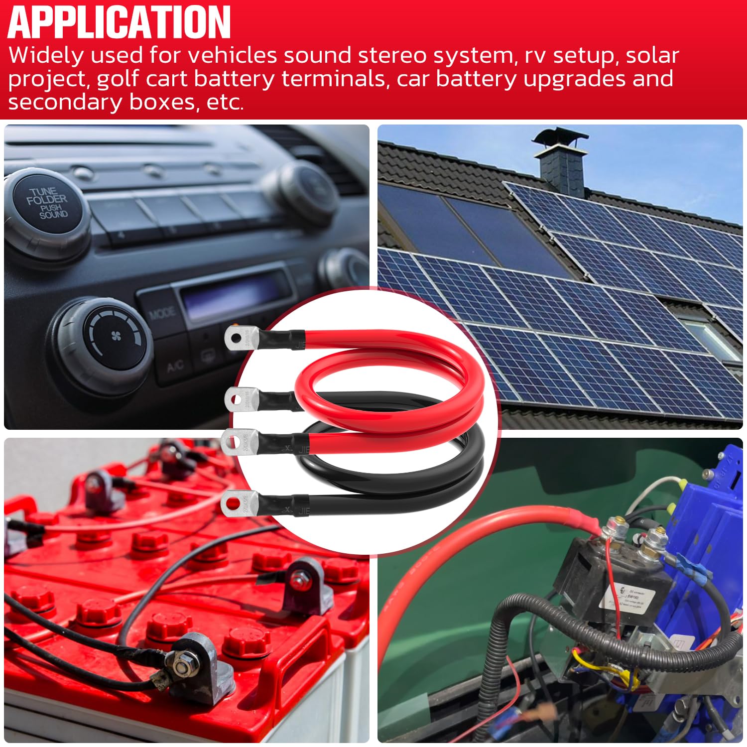 You can use these battery cables for replacement automotive, motorcycle, RV, camper, travel trailer and other vehicle wiring applications, grounding cables, golf carts, car audio stereo amplifiers, solar and many other DC applications Package included: 1 black+1 red cable Note: Please carefully chack all the product information to make sure this will fit your original unit Any questions, please tell us, we’ll answer you as quick as possible