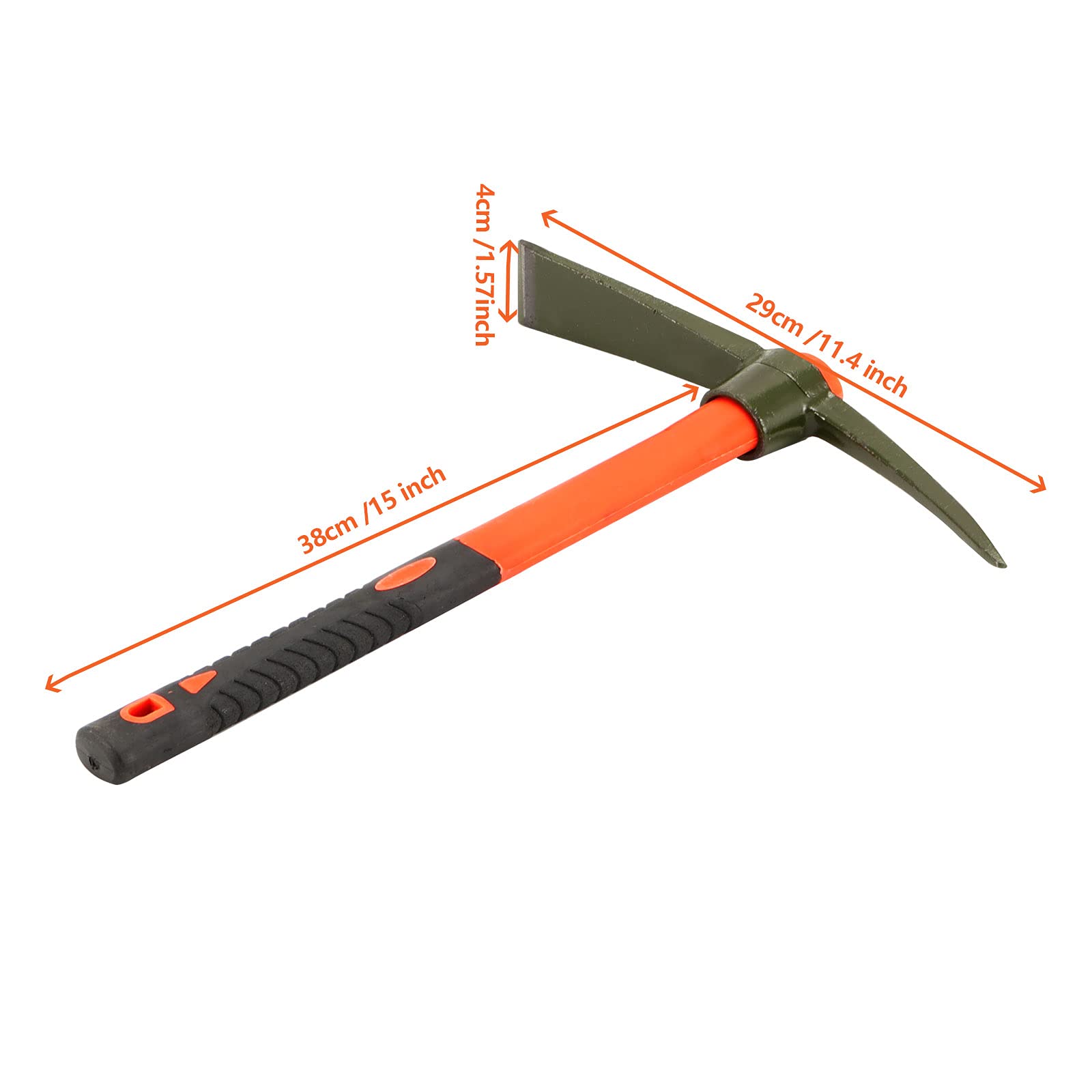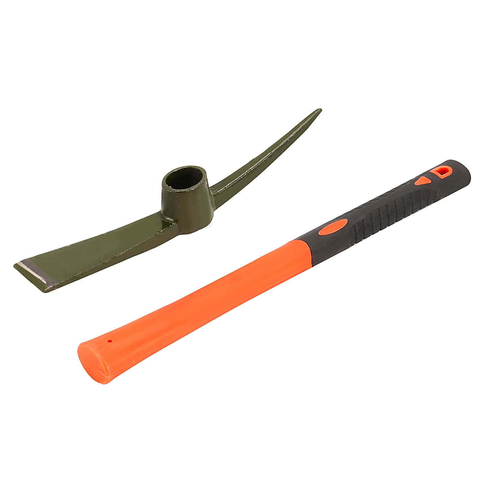 FIBERGLASS HANDLE - The 1.5lbs pick mattock with shock-absorbing fiberglass handle for increased friction while digging in tough soil and get sticky when wet that relieves hands pressure. It is high viz neon orange, easily to be found anywhere.