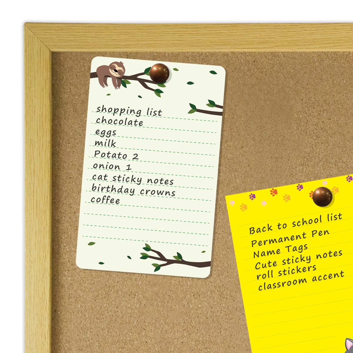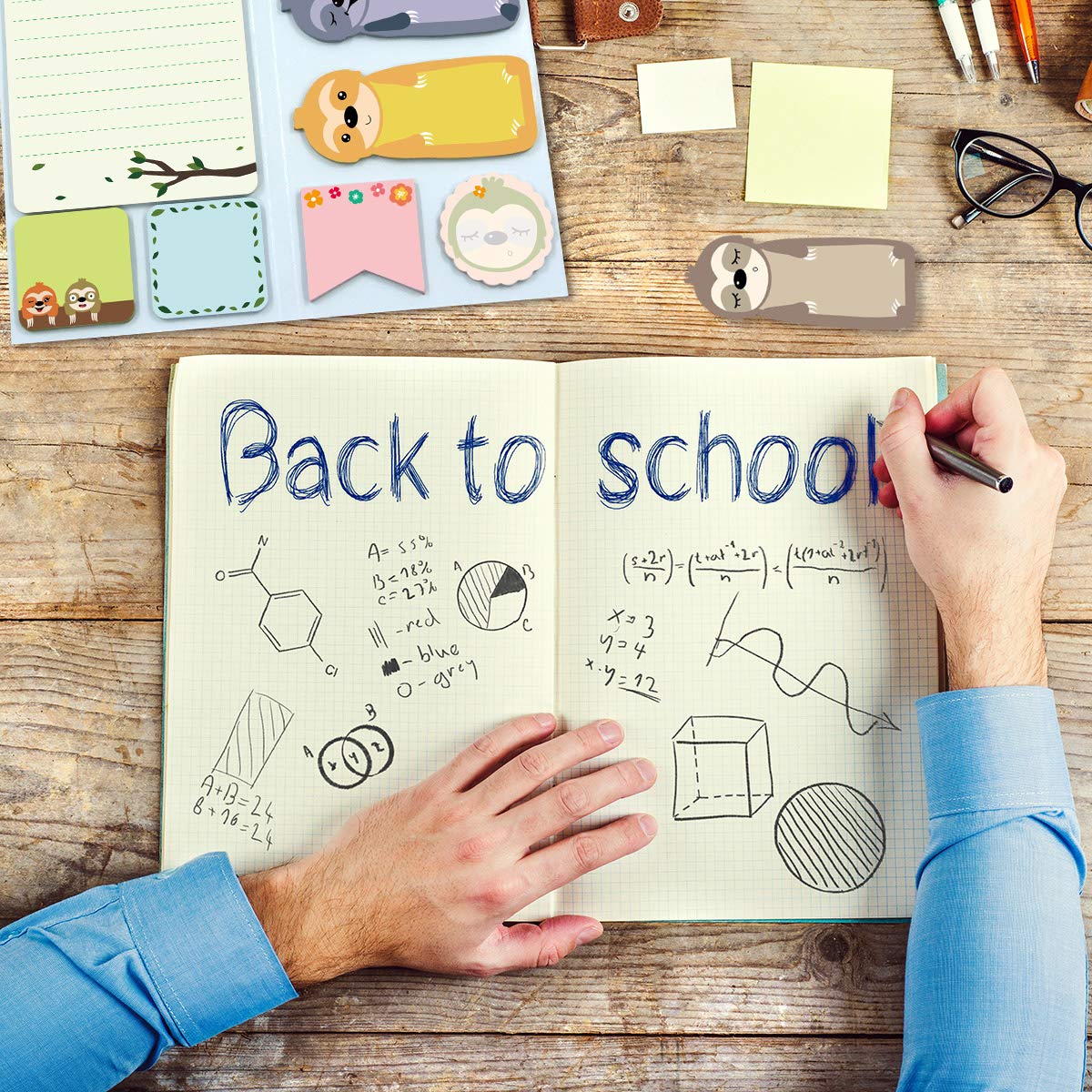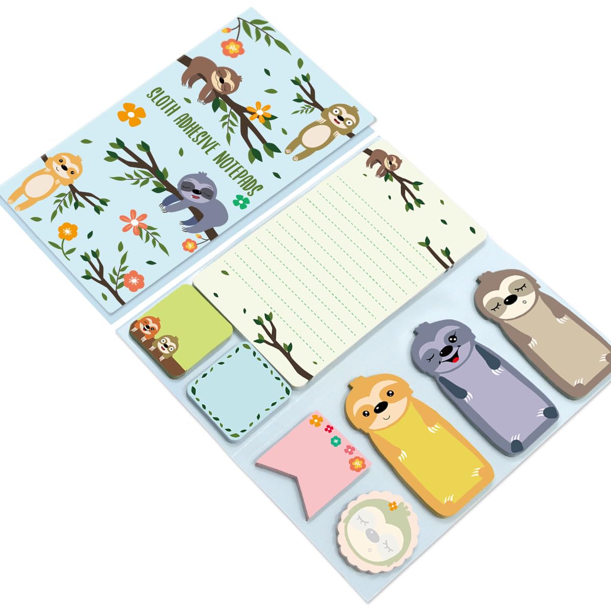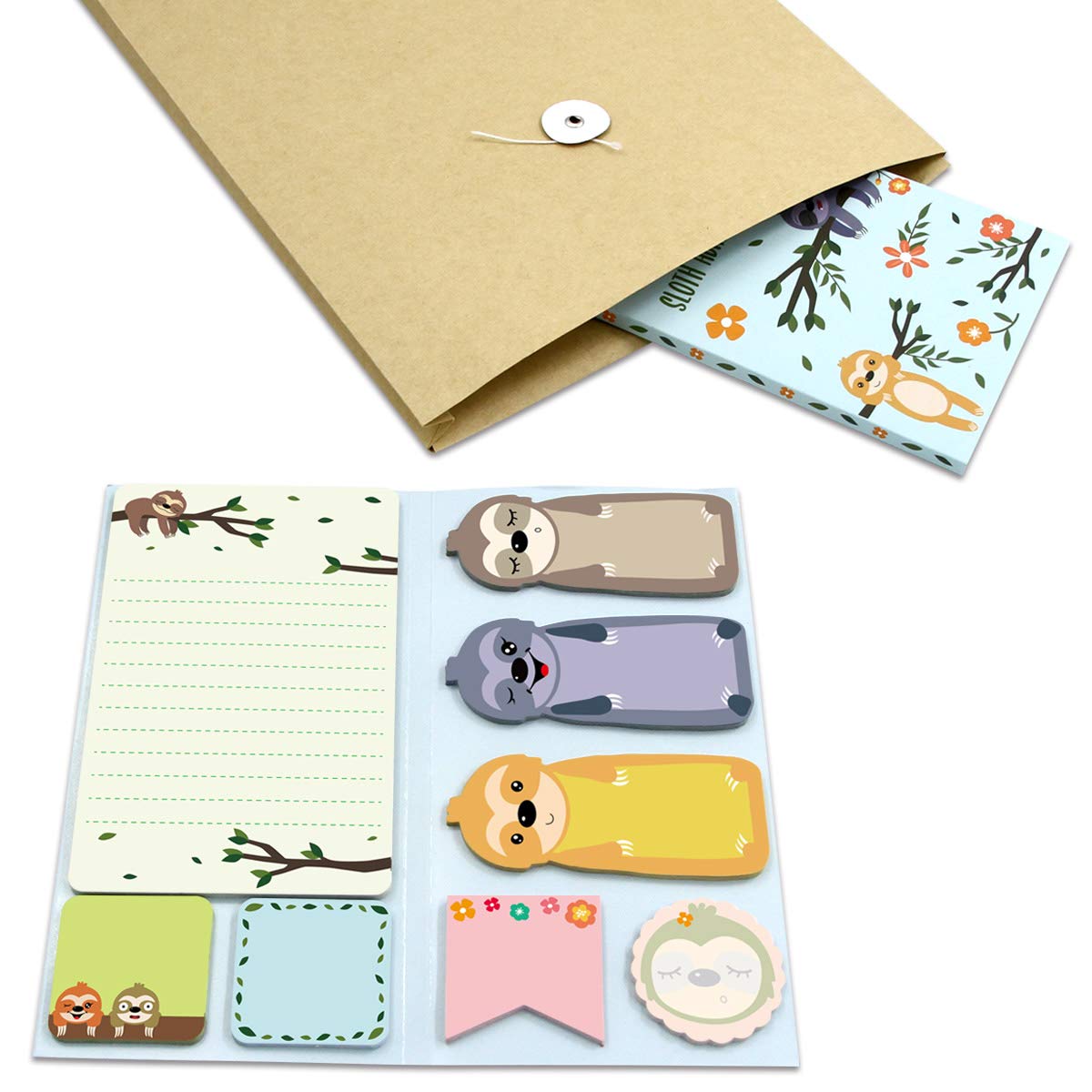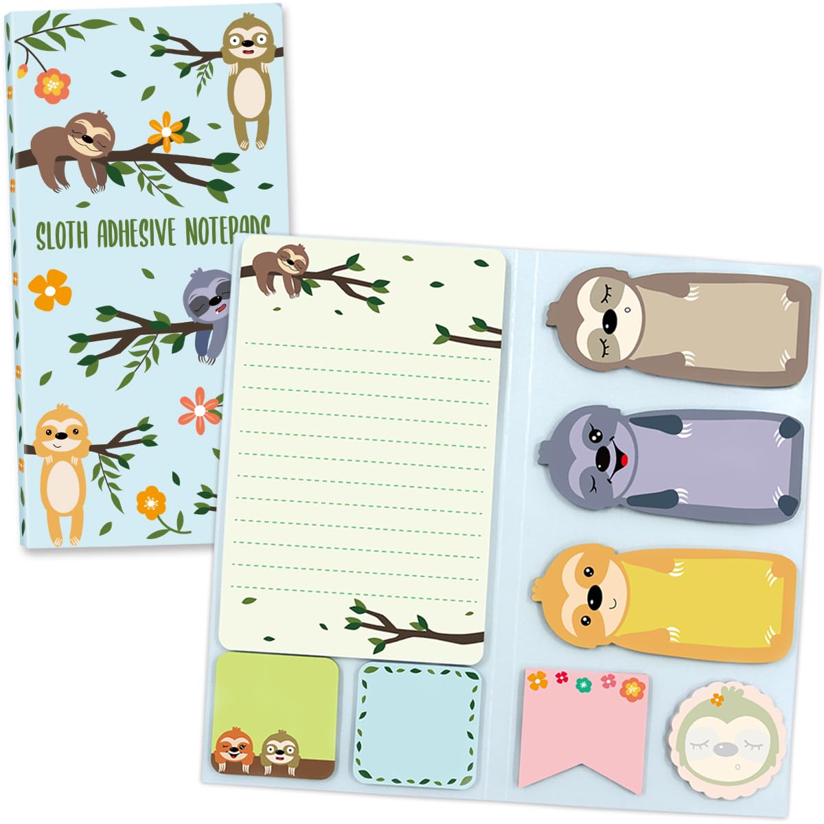 Package Includes: A sloth divider sticky notes bundle set; 30 sheets per pad, 240 sheets; 3.8 x 6 inches ruled lines pad; 4 small 1.7 X 1.7 inches small notes; 3 sloth shaped memo pads 3.7 X 4.6 inches; Glued on top