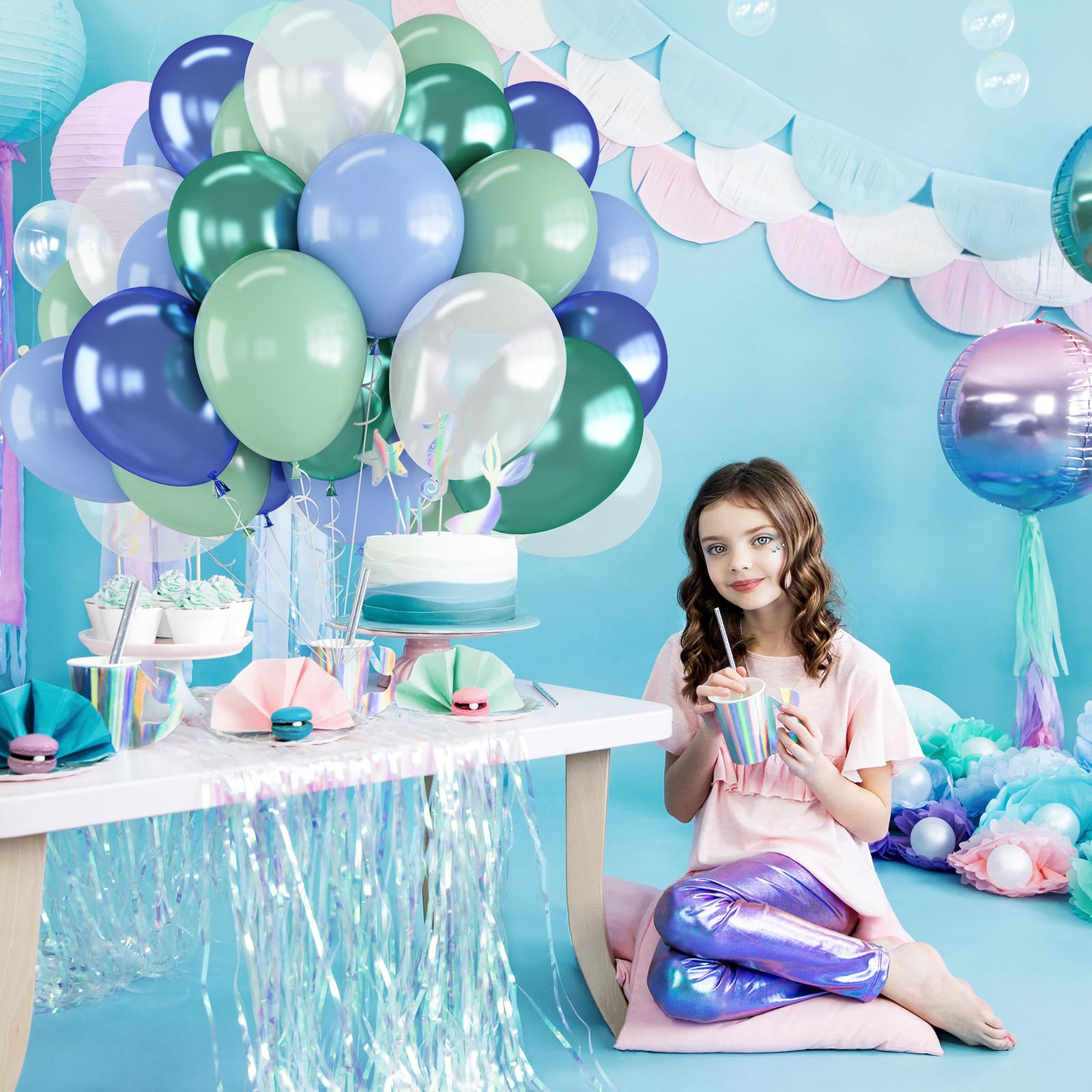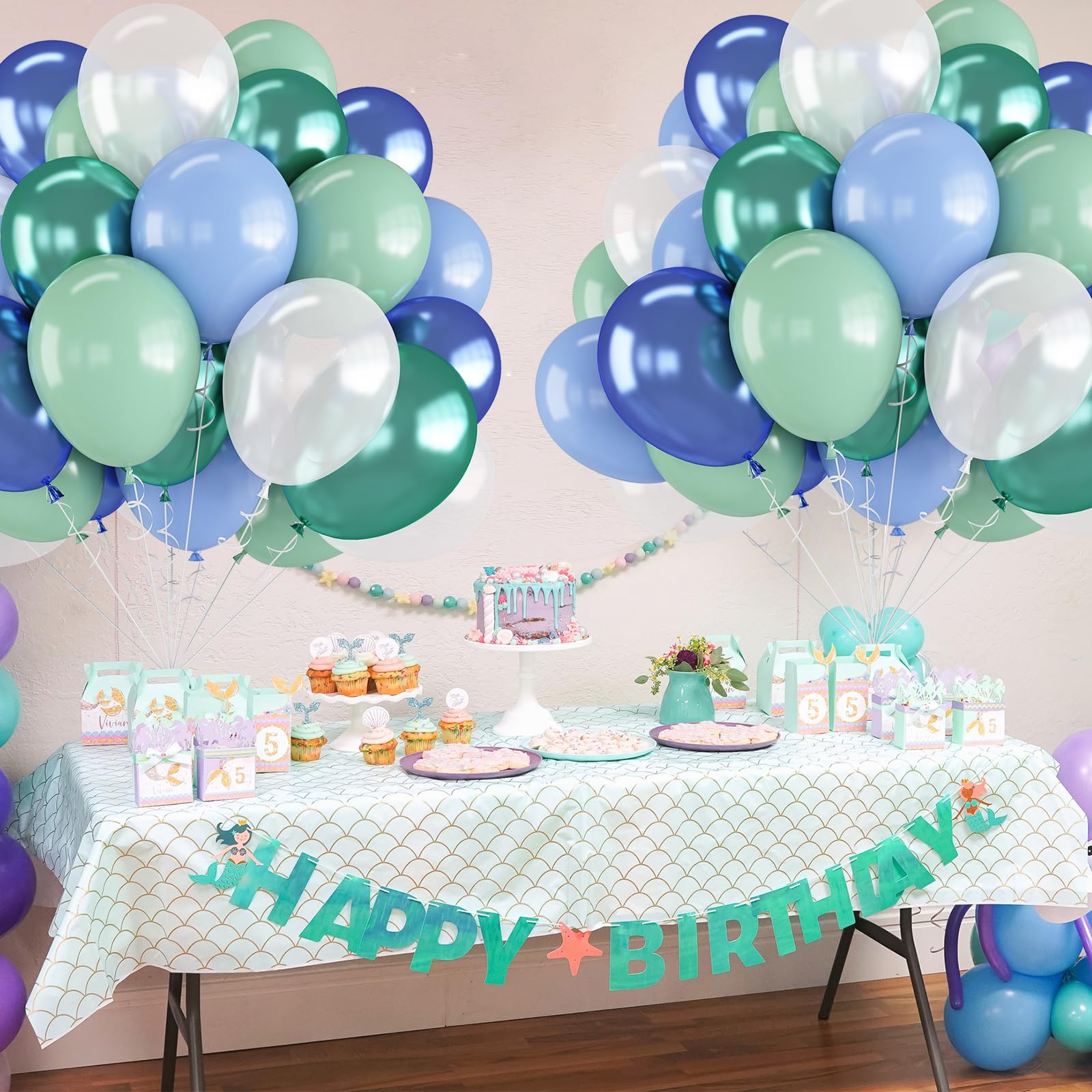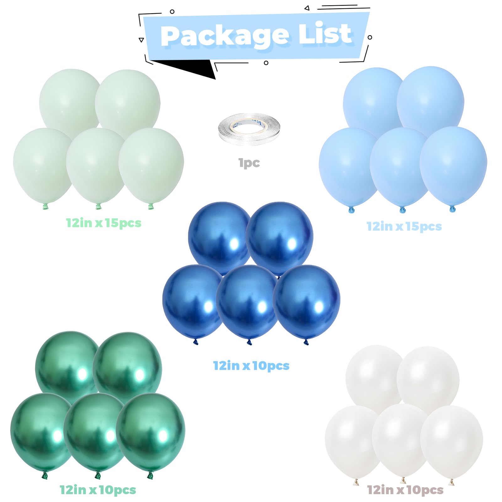 WHAT YOU GET: Green blue white balloons set includes 60pcs latex balloons: 15pcs 12inch pastel green balloons, 15pcs 12inch pastel blue balloons, 10pcs 12inch metallic blue balloons, 10pcs 12inch metallic green balloons, 10pcs 12inch pearl white balloons, 1 roll of ribbon, ideal for making balloon garland, balloon arch