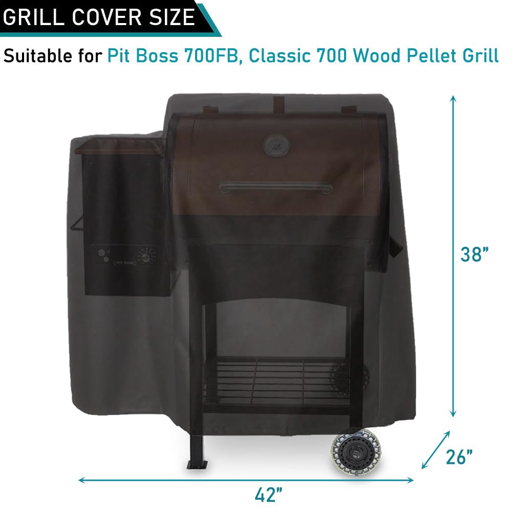 【Custom Fit】Measured 42"W x 26"D x 38"H. Designed for Pit Boss 700 Sq. In. wood pellet grill. Fits Pit Boss 700FB, PB700FB1, 700 Classic 700FBW2, Classic 700 Onyx PB700NX, 440TG, PB440FB1. Also fits for Louisiana Grills LG700, Rec Tec Patio Legend 410, RecTec RT-B380 Bullseye, and other pellet grills smokers with similar sizes.