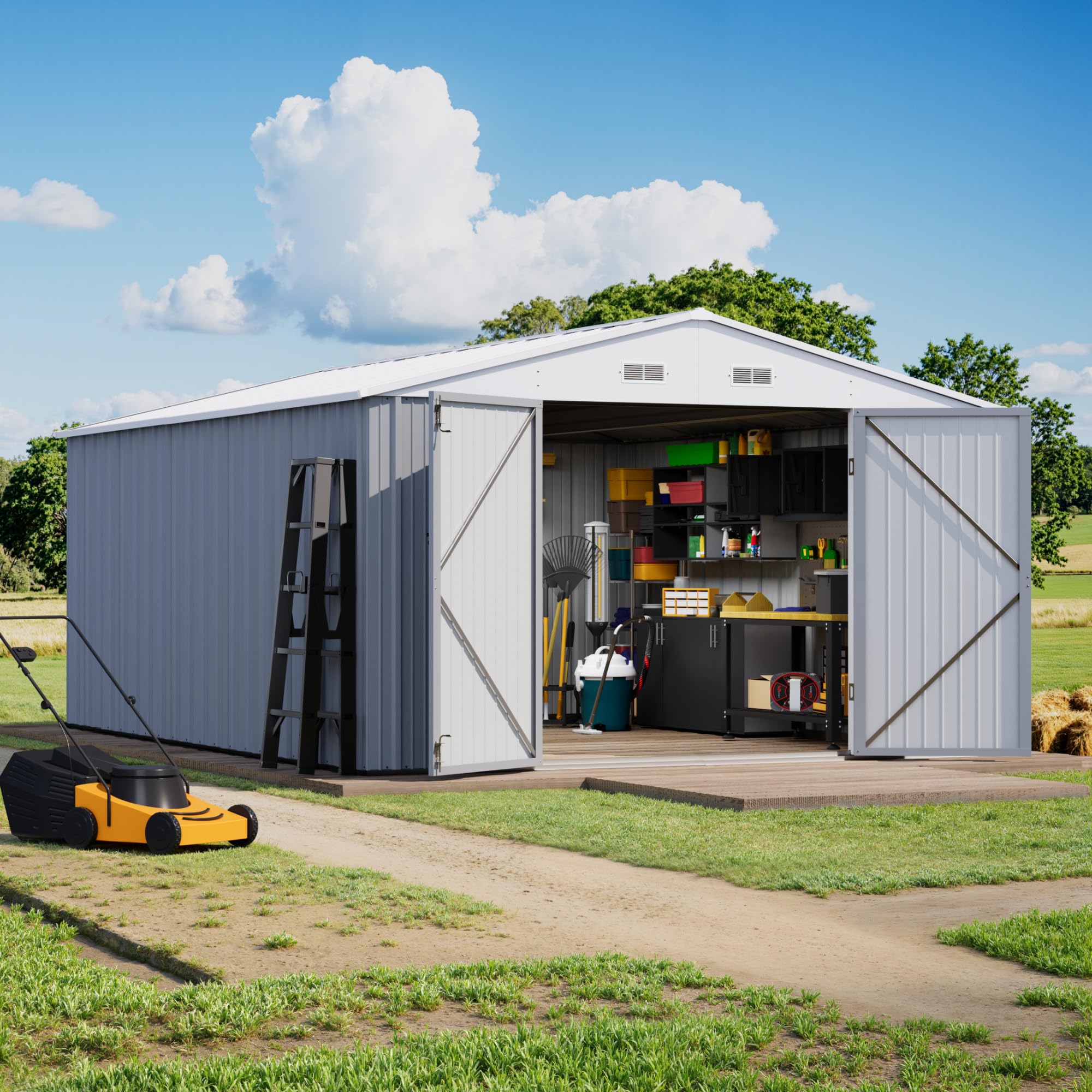 Sturdy Frame Structure – This metal tool shed comes with a durable frame only, without a foundation, allowing flexible placement on various surfaces.