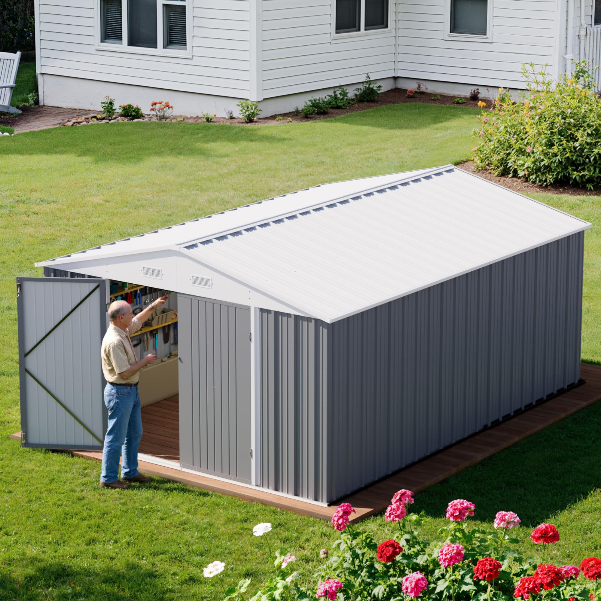 Greesum 10×14 FT Outdoor Storage Shed, Metal Storaged Sheds Without Floor, Tool Sheds with Lockable Doors and Sloping Roof for Garden, Patio, Backyard, Gray Feature: Durable & Versatile Metal Tool Shed – Secure Outdoor Storage Solution Keep your tools, garden supplies, or outdoor equipment safe and organized with this heavy-duty metal tool shed. Designed for durability and functionality, this sturdy frame-only structure (foundation not included) provides flexible placement on various surfaces. Installation may be challenging—follow the instructions carefully and wear the provided gloves to avoid sharp edges. Upgrade your outdoor storage with this robust and versatile metal tool shed—order yours today! Specification: Material: Metal. Package includes: A tool kit A Metal Outdoor Storage Shed A manual of installation and usage Notice: There may be some differences between photos and items in term of color because the influence of lighting during the shooting or the settings of the computers’ display screen.