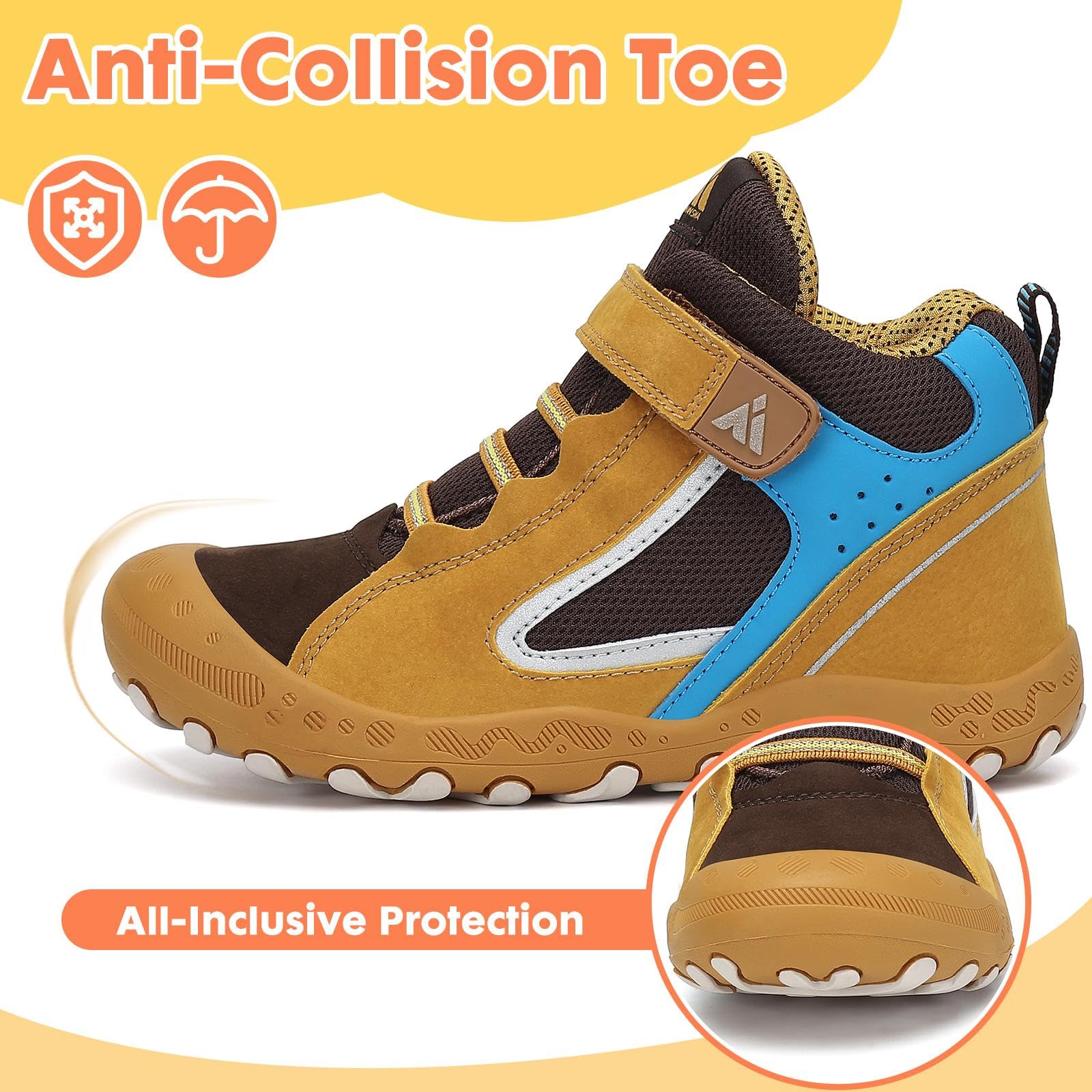 ANTI-COLLISION TOE CAP: Kids hiking boots are with all-inclusive anti-collision rubber toe cap design to protect children's feet safety when playing outdoors.