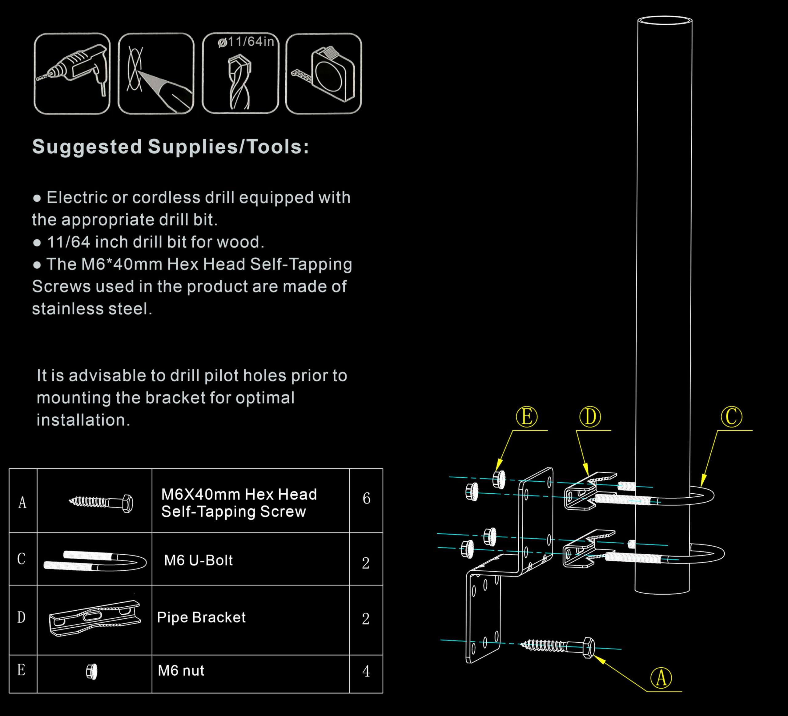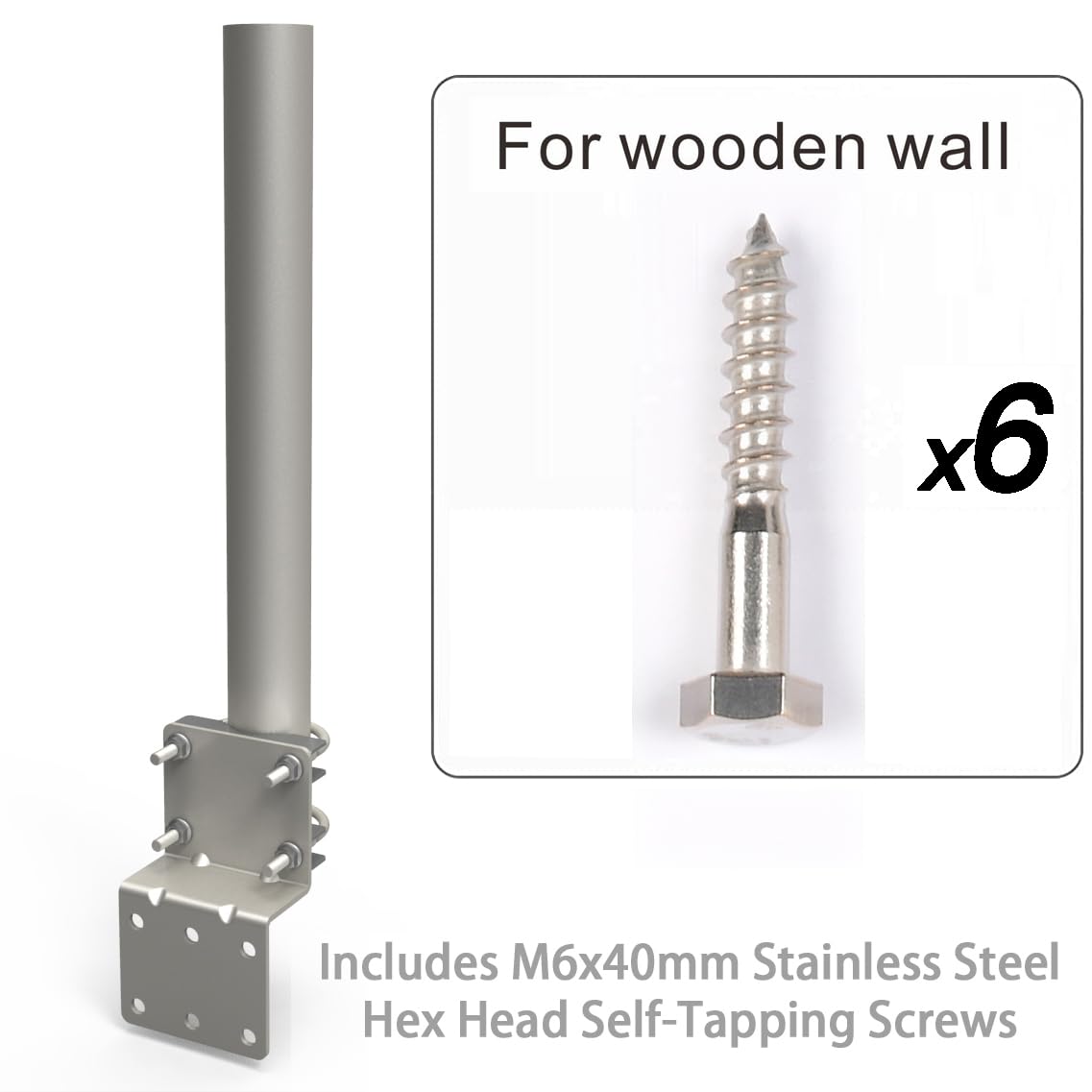 Complete Mounting Kit Included – Package contains 15 3/4" length, 1 1/4" OD pole, 3mm thick mount bracket, 6 × ST6×50mm stainless steel hex head self-tapping screws, 2 clamp U-bolt kits, 4 × M6 nuts, and installation manual for a secure and easy setup.