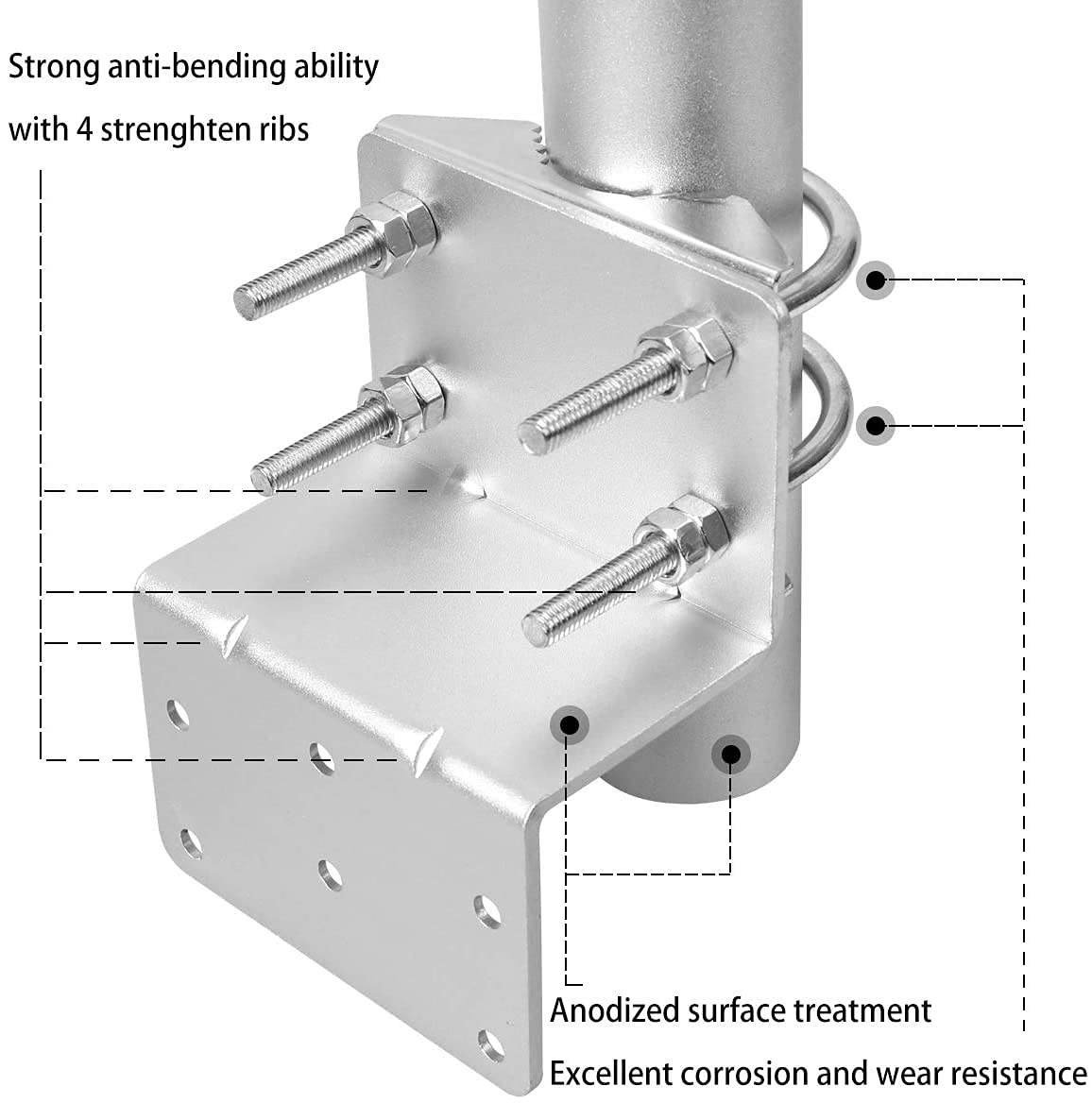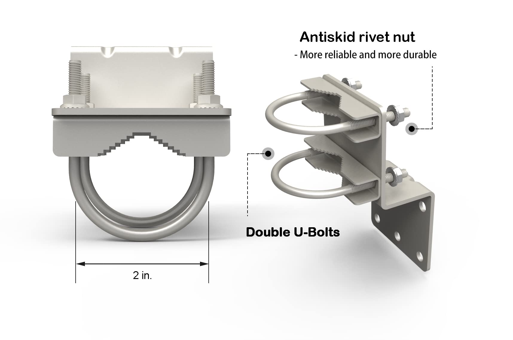 Heavy-Duty & Stable Design – 3mm thick steel mount bracket with enlarged base plate, dual clamp U-bolts, and dual-screw fixation ensure exceptional stability and durability, even in harsh outdoor conditions.
