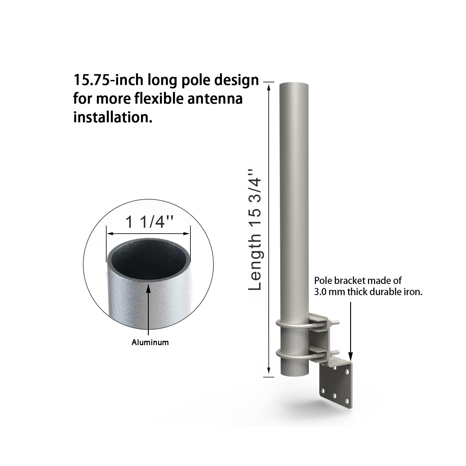Thicker & Extended Pole Size – 15 3/4" length and 1 1/4" outer diameter (OD) provide versatile mounting options; suitable for antennas (Television, Radio, Satellite, Starlink) as well as Weather Stations, WiFi, and Cell Phone Signal Boosters.