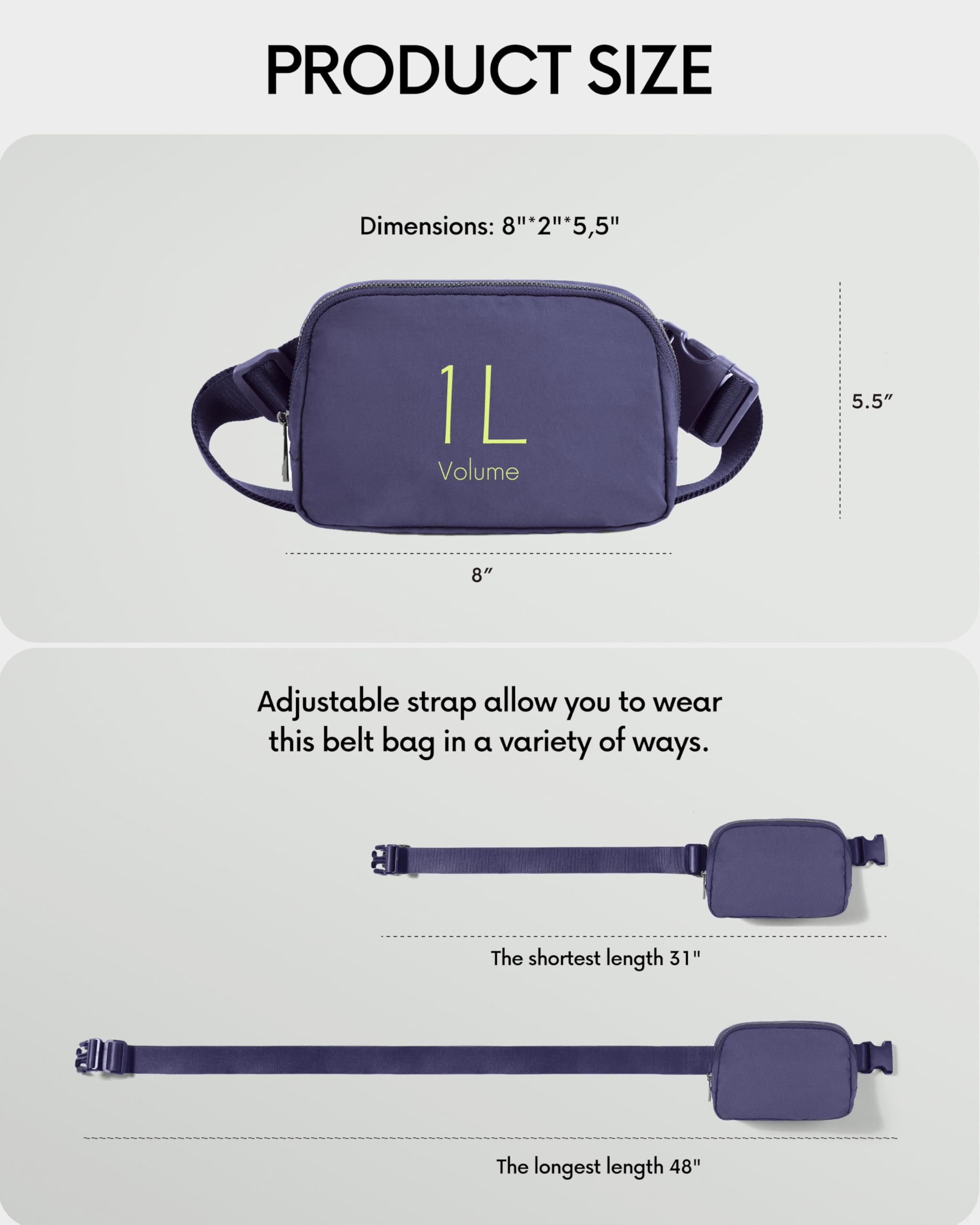 Versatile Style: Adjustable Strap allow you to wear this belt bag in a variety of ways. It can be carried as cross bag, shoulder bag, waist bag or handbag. It’s all up to you.