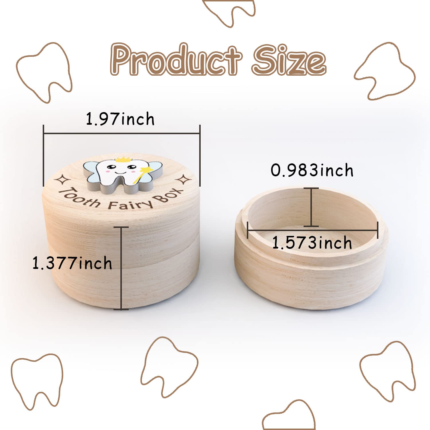 ▶▶▶ An absolutely precious gift to give your little one. The Tooth Box is an nice place to protect precious little teeth and witness the growth of your baby with the tooth fairy. ►Package includes: 1 Tooth fairy box ►Size: Outer size: 2*2*1.4 inches Inner size: 1.6 x*1.6*1 inches 3D tooth size: 0.8*0.7*0.16 inches ►Weight: 0.084LB ►Material: Wood ►Notes: ☆Due to the natural properties of wood, the grain of each Tooth Fairy Box may vary slightly. ☆Since the size above is measured by hand, the size of the actual item you received could be slightly different from the size above. ☆Please disinfect the fallen teeth before putting them in the box. ☆How to store baby teeth: 1. Clean your baby's teeth with water. 2. Soak in hydrogen peroxide or bleach. The soaking time is about half a day to one day. 3. Dry the teeth. You can blow dry with a hair dryer, or let it dry naturally. 4. Put it in tooth wooden box for preservation. ▶▶▶Any problem please do not hesitate contact us.