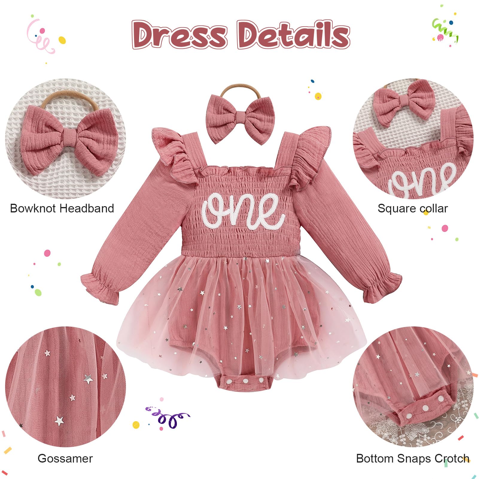 Design: Newborn baby girl playwear romper dress with long sleeve, solid color, multi-layered tulle, Snap leg openings for easy diaper changes, easier morning for novice mother.Cute princess 1st birthday outfit, fashionable and adorable embroidery ONE printed themed birthday clothes perfect for creating beautiful memory of her first birthday.