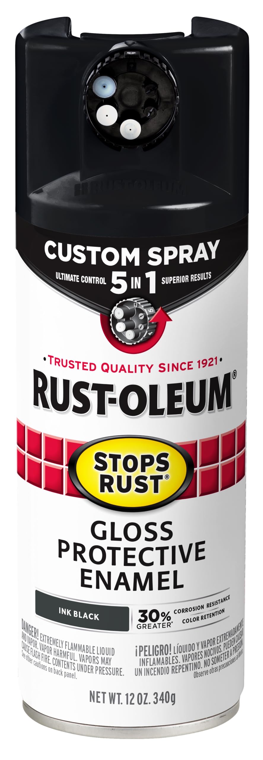 Rust-Oleum Stops Rust Protective Enamel with Custom Spray 5-in-1 technology provides a premium spray paint experience with unlimited ways to get your project done right. The innovative Custom Spray 5-in-1 dial allows you to choose from 5 spray paint nozzles for ultimate control and the advanced Stops Rust formula provides 30% greater corrosion resistance and color retention compared to the standard Stops Rust formula. Use the high output spray nozzle for large curved surfaces, standard for a traditional experience, low output for details and corners without drips and runs, and vertical or horizontal fans for flat surfaces. When you're done, turn the dial to the locked position and store the remaining spray paint for your next project.