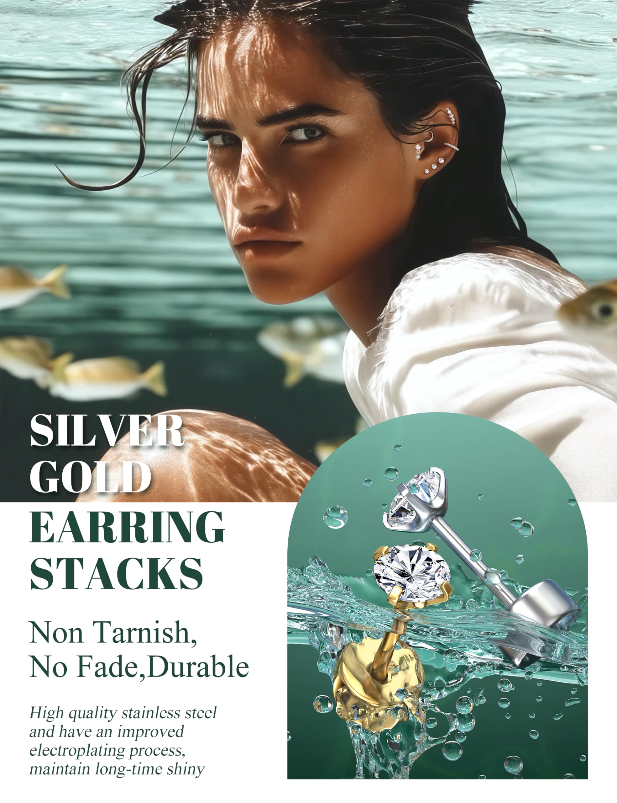 【Hypoallergenic Surgicla Steel Earrings】--These hypollergenic earrings for women crafted from 316L stainless steel,lead & nickel free earrings,perfect hypoallergenic earrings for sensitive ears women.Real 14K gold plated,waterproof earrings,non tarnish & no fading.5A CZ is set flush in the dainty earrings with flat backs,sparkly on your ear,durable,long-lasting shiny