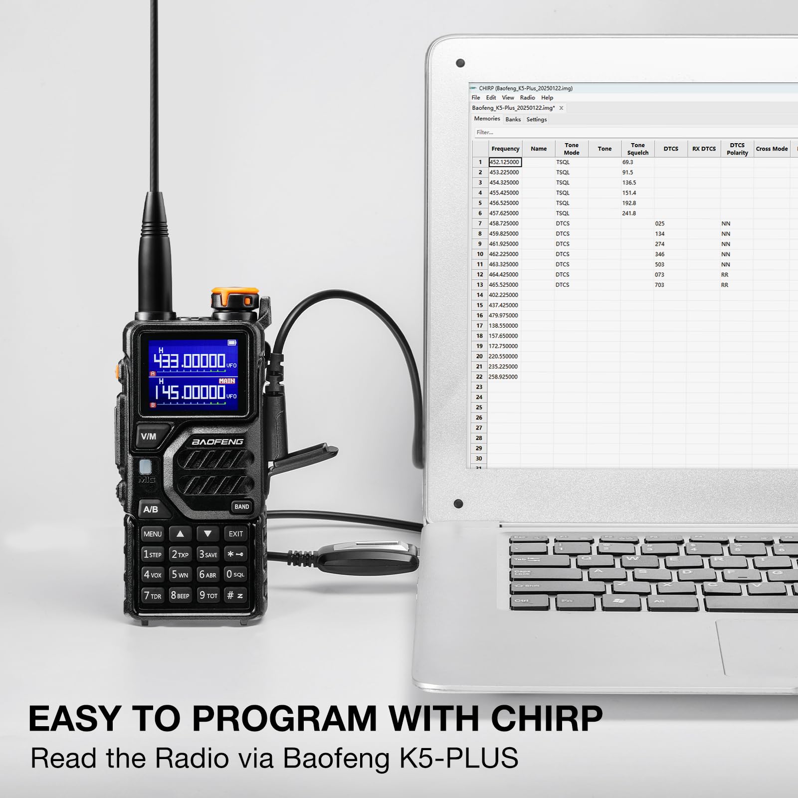 CHIRP Programmable: Unlock your radio's full potential with Chirp programming. Easily configure frequencies, channel names, CTCSS/DCS tones, and power levels. With batch editing, wide model compatibility, and an intuitive interface, Chirp streamlines programming for enhanced versatility. This full kit includes a free programming cable