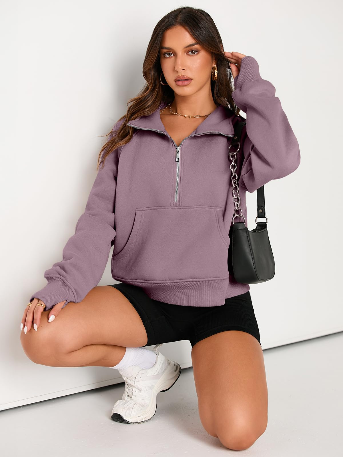 ★Fashion: 1/2 zip up collar sweatshirt, the zipper works smoothly, solid color, stand collar, y2k clothing, fleece lined, soft inside, relaxed fit, crop top