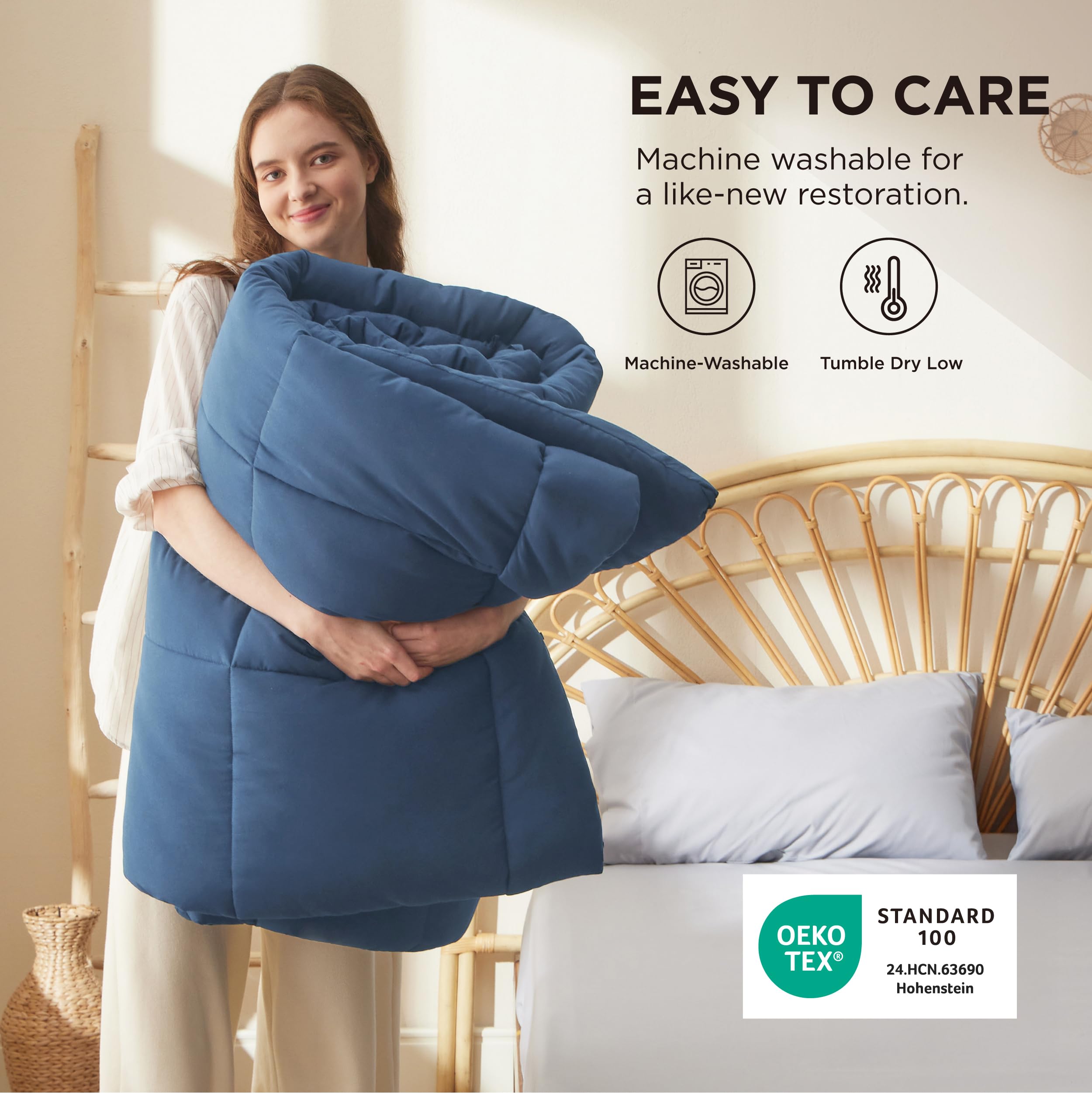 EASY TO CARE:Please gently fluff the comforter and let it rest for up to 24-48 hours after taking it out of the box to ensure maximum fluffiness. Machine wash separately in cold water on a gentle cycle and tumble dry low for a like-new restoration