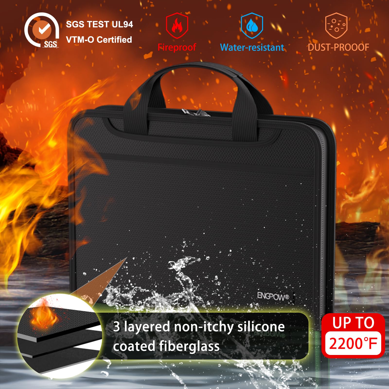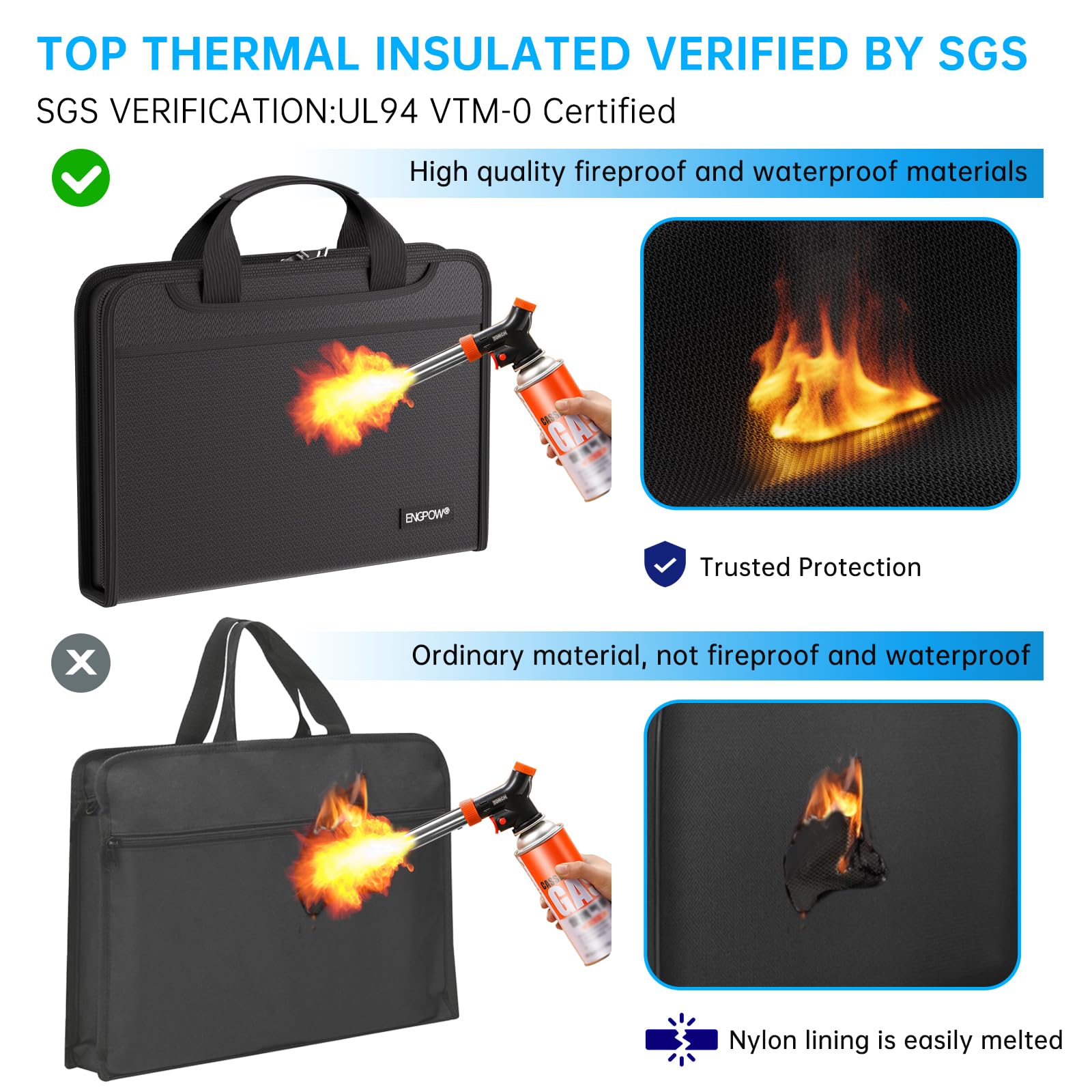 High-Quality Materials: Protect your files with ENGPOW fireproof accordion file organizer.It is made of 3-layered non-itchy silicone-coated fiberglass which withstand the temperature up to 2200℉.It has been passed by SGS TEST(UL94 VTM-0 Certified).Fireproof File Folder is fireproof&Water-resistant,which can effectively protect your important documents in a fire,flood,and wet weather. They will further keep your files intact.Giving you time to save your important documents when disaster strikes