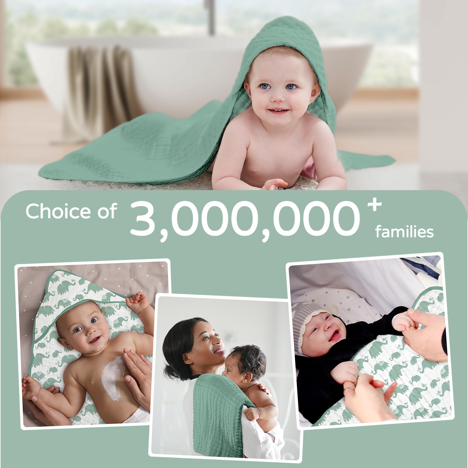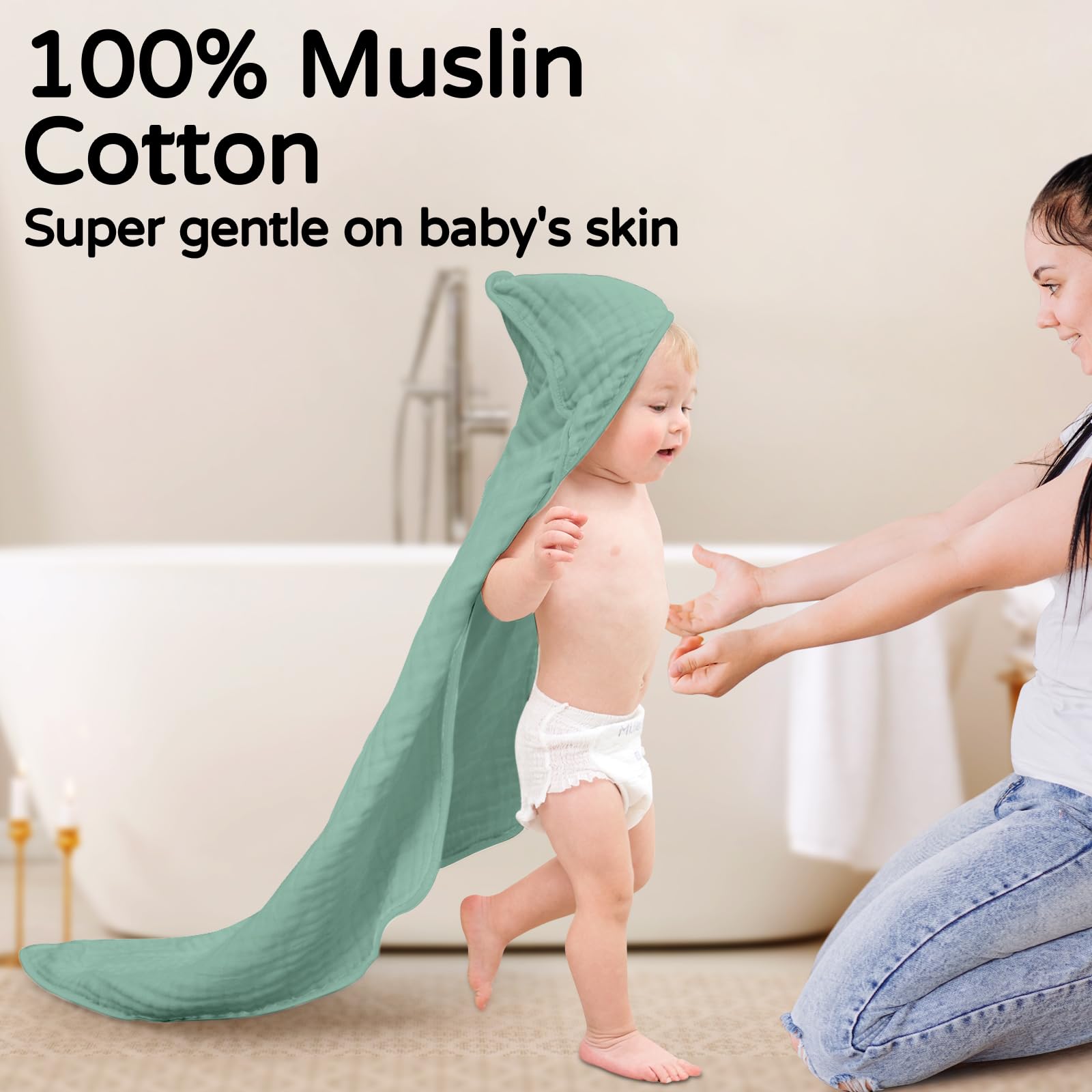 [Soft and Absorbent] - 100% high quality muslin organic cotton, the best fabric for babies, makes the baby bath towel super soft than regular cotton towel. It absorbs the water off baby quickly and keeps baby warm after baths.