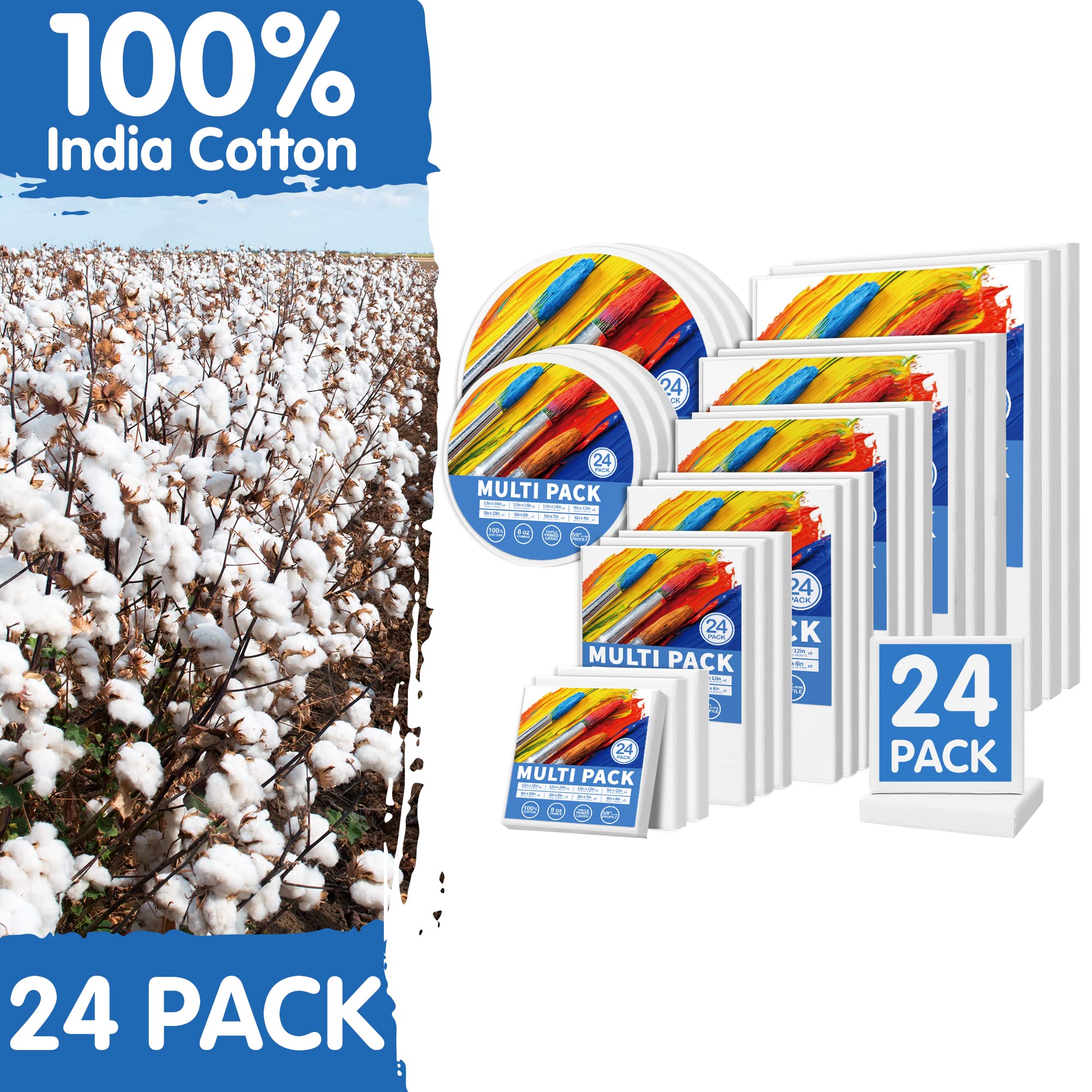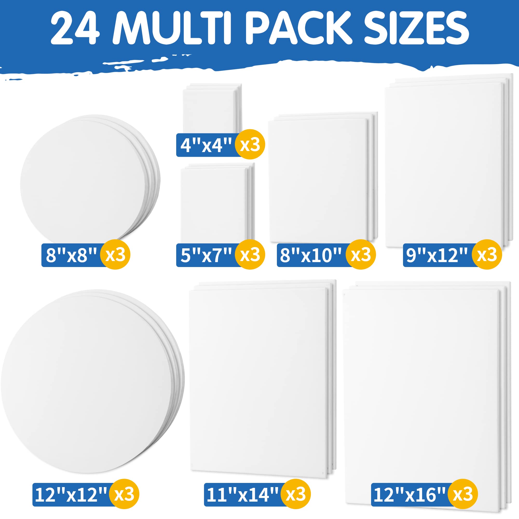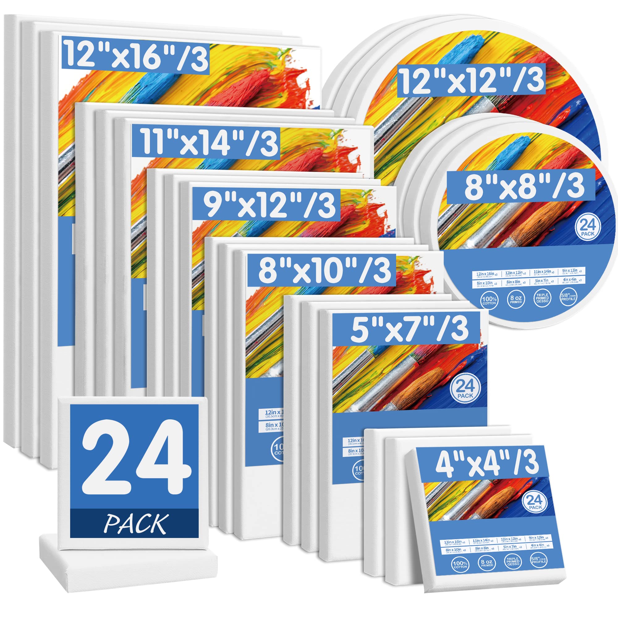 VARIETY OF SIZES AVAILABLE: Each canvas set comes with a total of 24 art canvases for painting. Youβll get 4β x 4β, 5βx 7β, 8x10", 9x12", 11x14", 12x16" pre-stretched canvas (3 of each), Round Canvas 12x12", 8x8" (3 of Each). You can find the perfect one to display your latest work on.