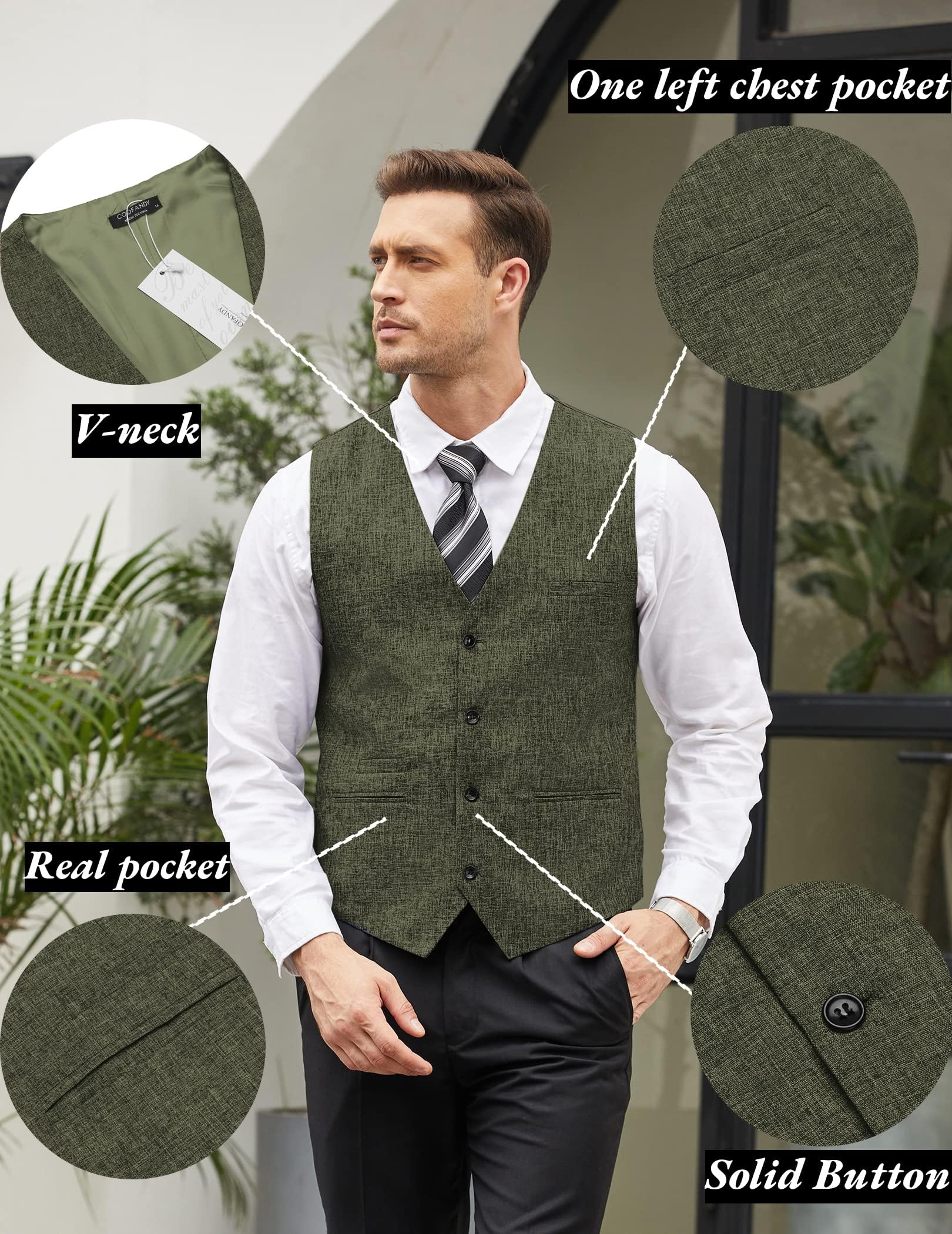 Business Modern Vest Design--- Leisure simply style suit vest beautifully cut, excellent craftmanship, designed with 2 front pockets,1 chest pocket, 6 button front closure, adjustable back strap offers you more accurate fit.
