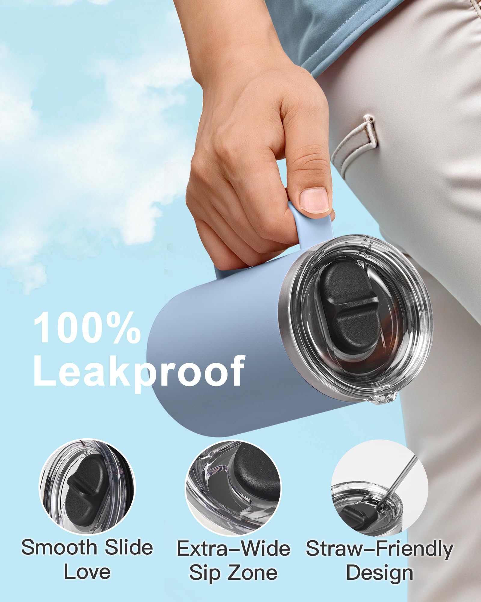 100% Leak-Proof Slider Lid: Exclusive slider lid glides smoothly,settled and locks securely with an airtight seal, staying 100% leak-free even when inverted. You’ll love the effortless sliding action that makes sipping on the go a breeze. Stainless steel coffee mug’s wide-mouth design with soft straws lets you sip comfortably, whether you’re using a straw or drinking straight from the cup!