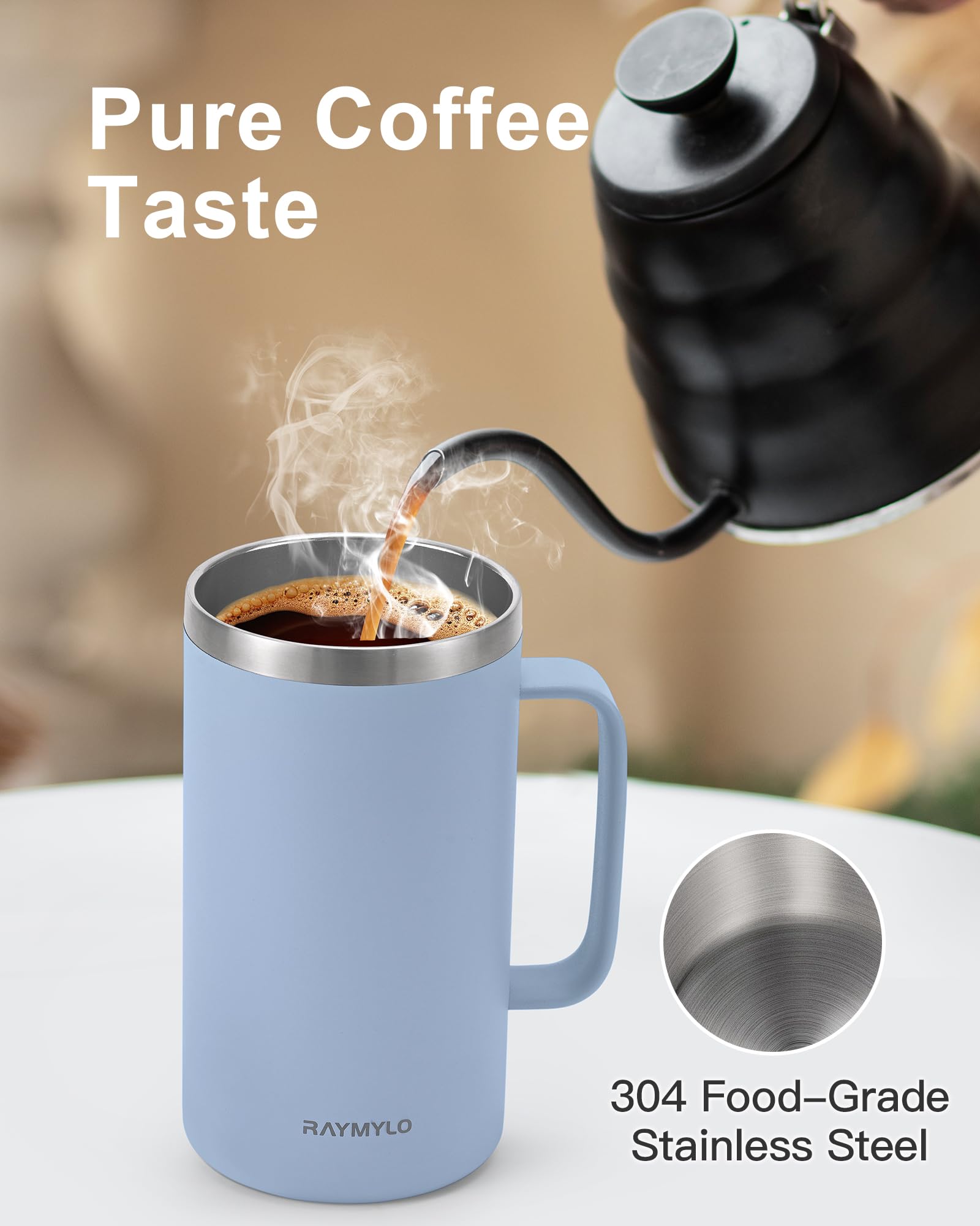 Pure Coffee,Zero Metallic Aftertaste Guaranteed: RAYMYLO coffee mug crafted from 304 food-grade stainless steel, this reusable coffee cup with lid ensures zero metallic aftertaste. Enjoy your coffee, tea, or cold brew with uncompromised flavor ! Perfect for coffee lovers and tea enthusiasts alike.