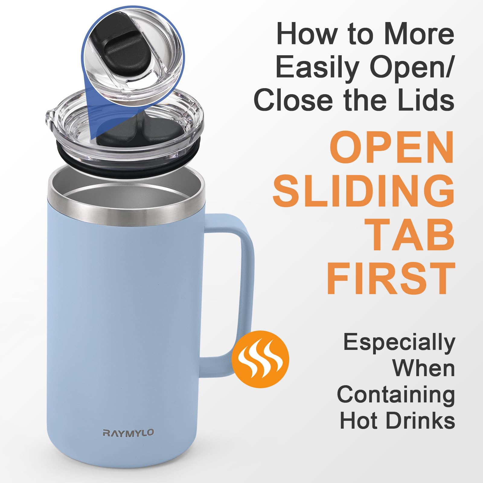 How to More Easily Open/Close the Lids: To ensure leak-proof performance, our lid is tightly sealed which may make it harder to remove or install. lf you face this issue, try two solutions: First, check if the sealing ring is properly positioned and adjust it if needed. Second, slide the tab while removing or installing to balance the internal andexternal air pressure.
