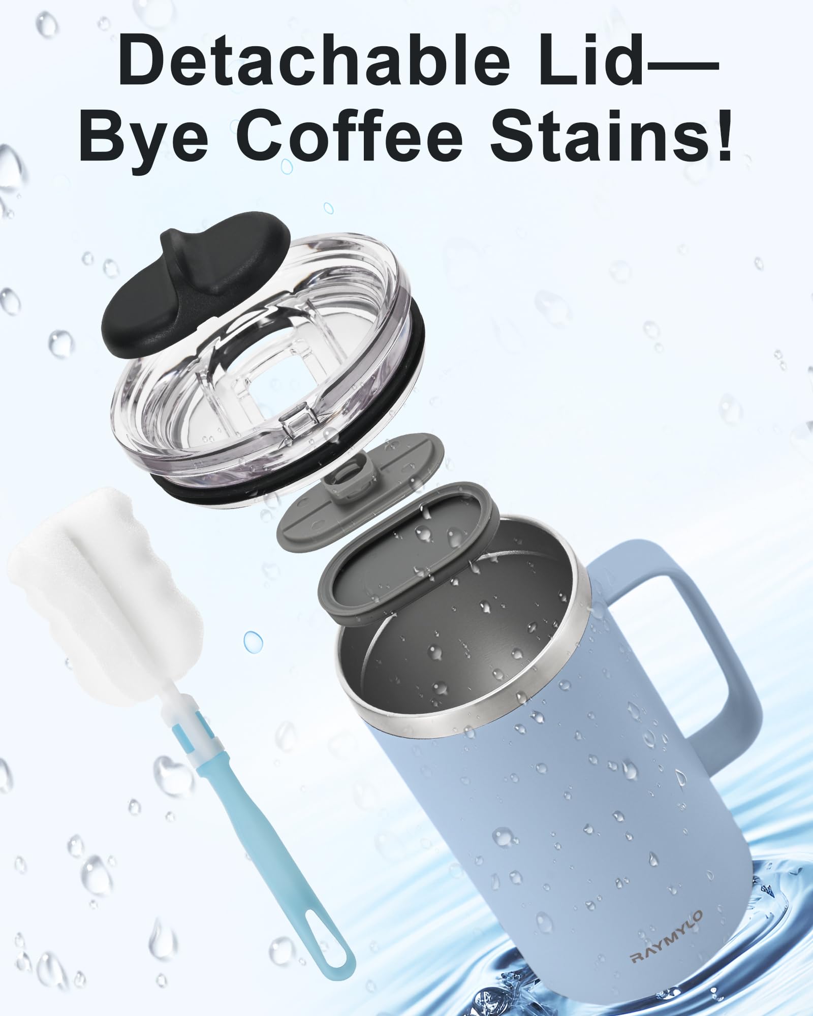 Effortless Cleaning: The reusable coffee mug features a detachable lid that takes off easily. Its user-friendly design means disassembly and reassembly are a breeze, allows you scrub away coffee stains from every nook and cranny. The included cup brush reaches deep into the stainless-steel interior, leaving no stubborn residue behind. Keep your coffee mug spotless with ease!