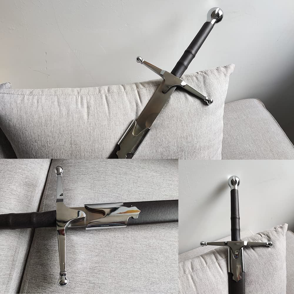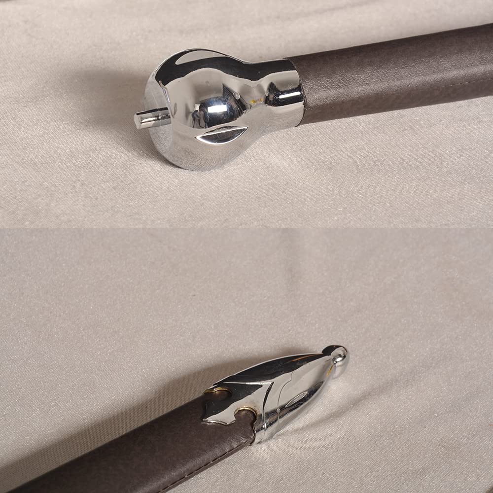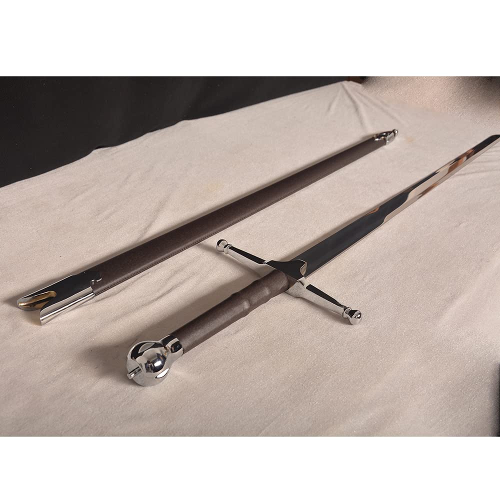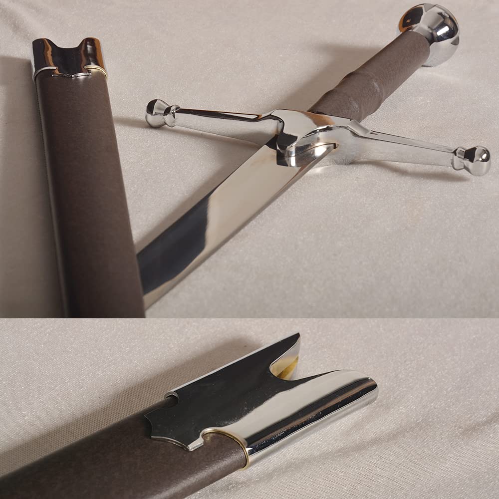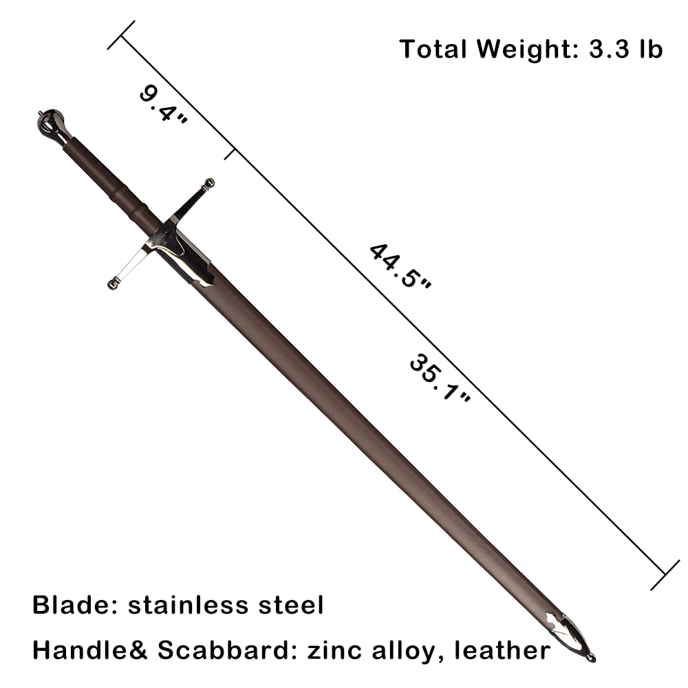 【Specification】Total Length: 44.5 in; Handle: 9.4 in; Blade: 35.1 in; Total Weight: 3.3 lb 【Material】Blade: stainless steel; Handle, Scabbard: zinc alloy, leather. 【Application】Perfect for Cosplay, gifts, collection 【Design】Vintage black-brown leather handle and scabbard, simple design 【Note】Please note that the blade is not sharp.