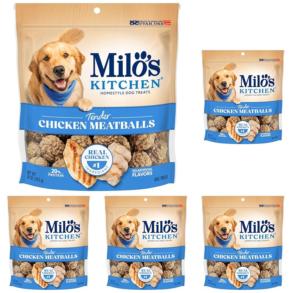 Contains one (1) 10-oz. bag of Milo’s Kitchen Chicken Meatballs dog treats