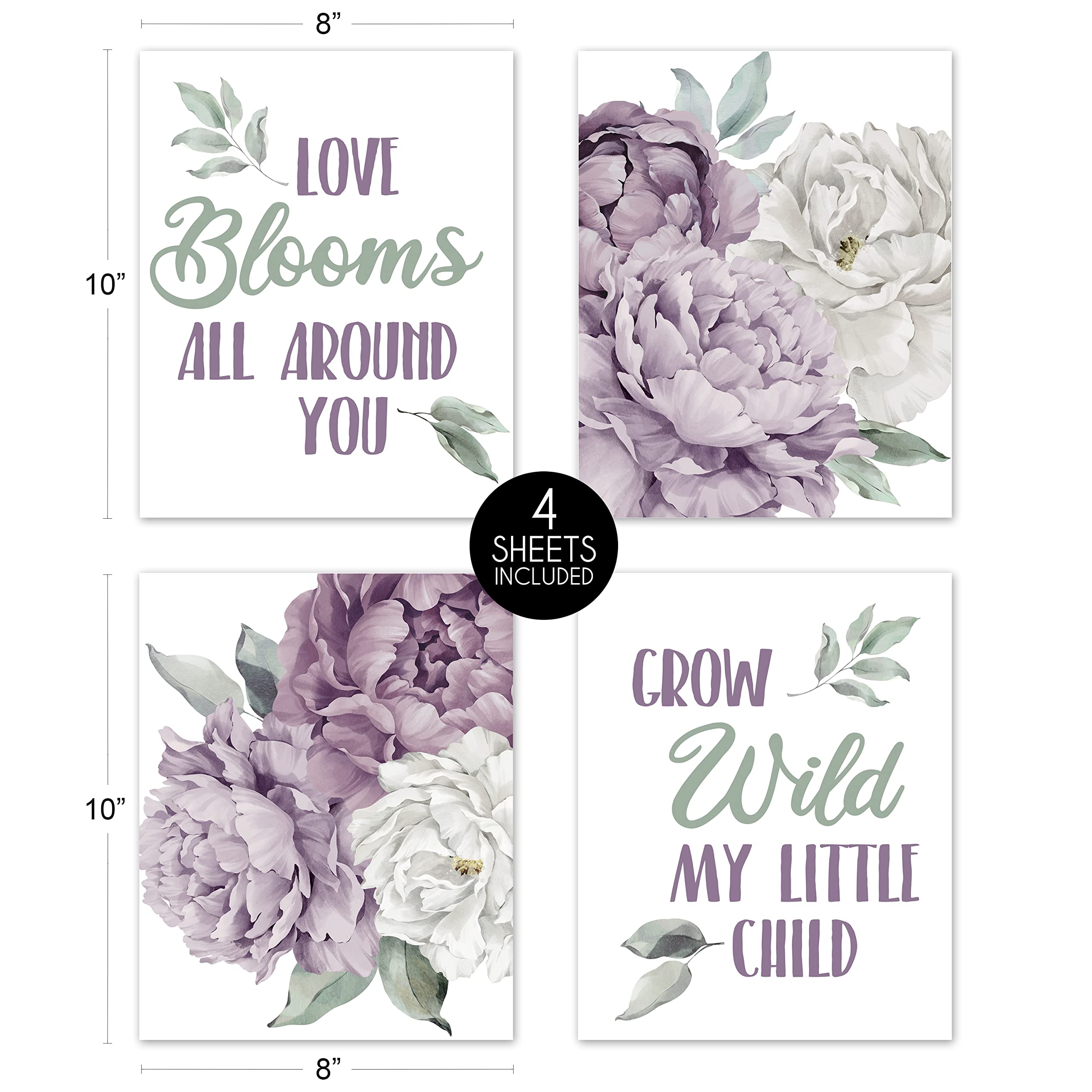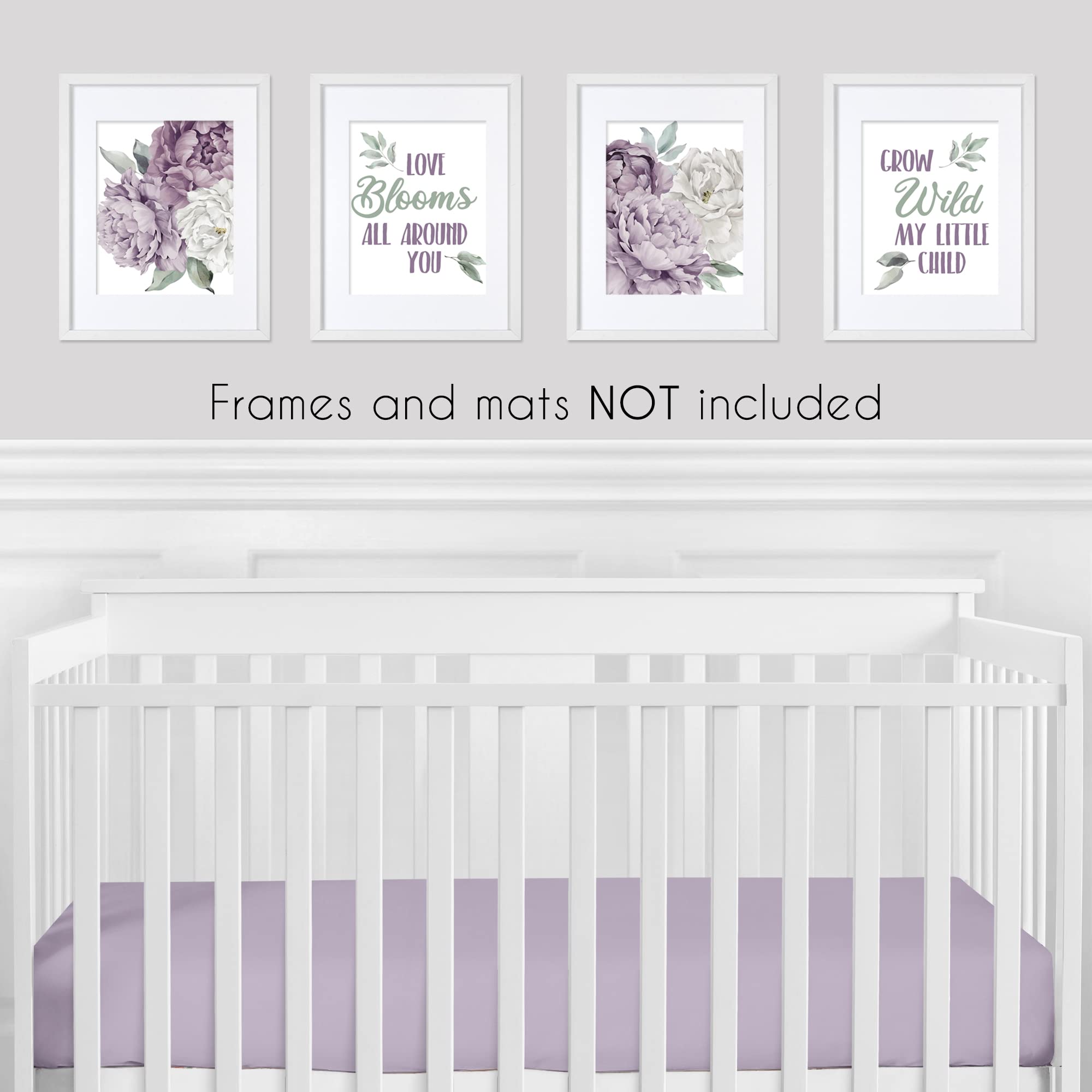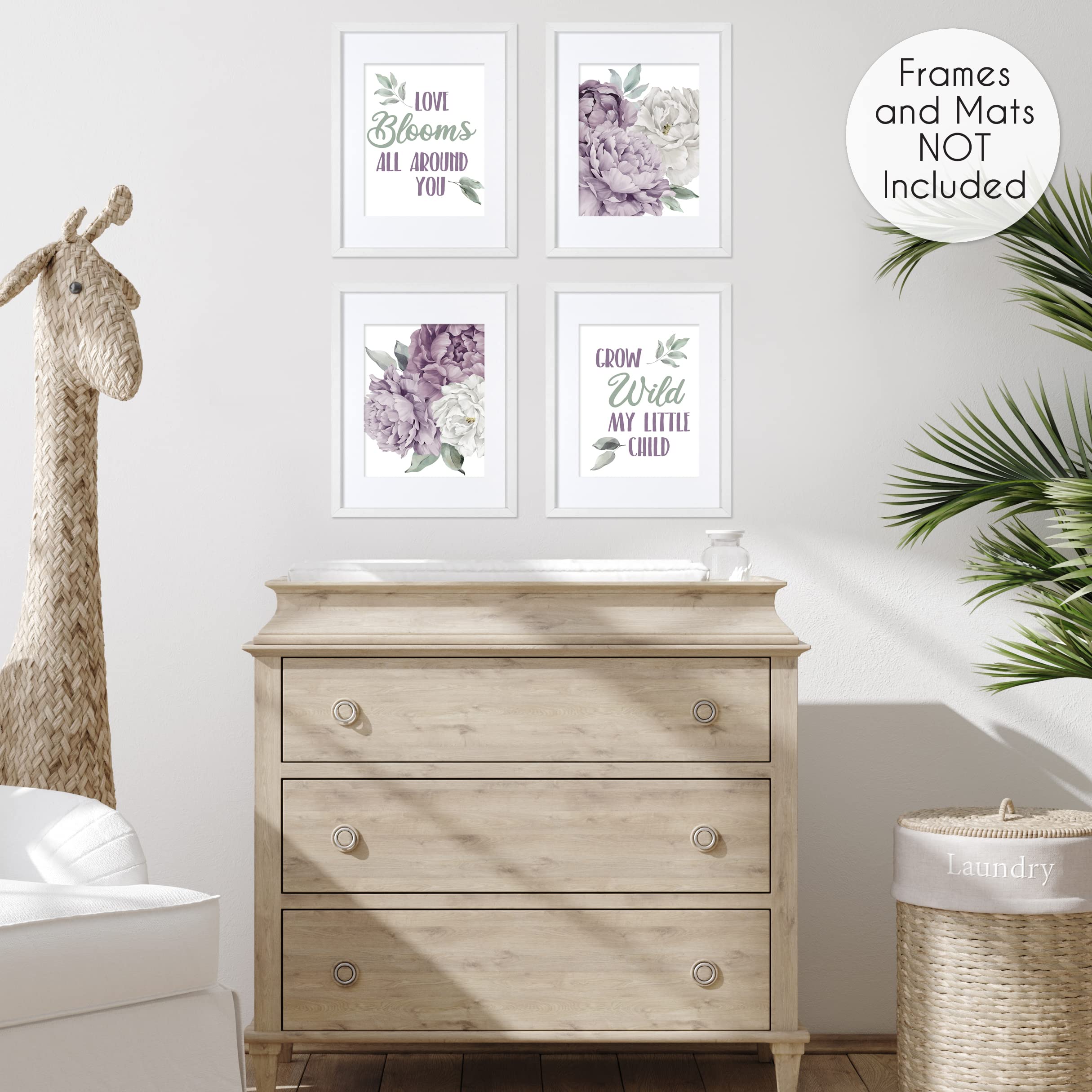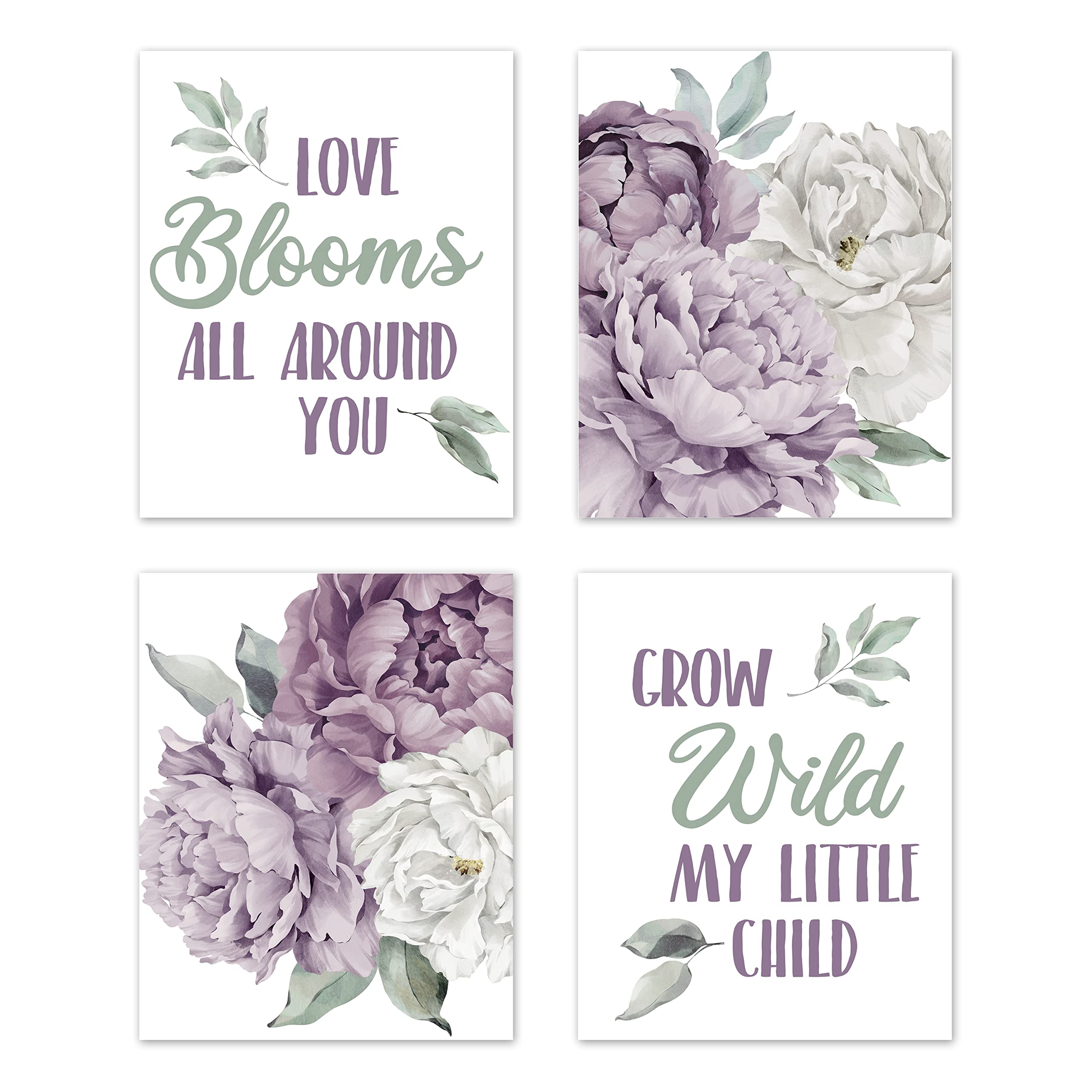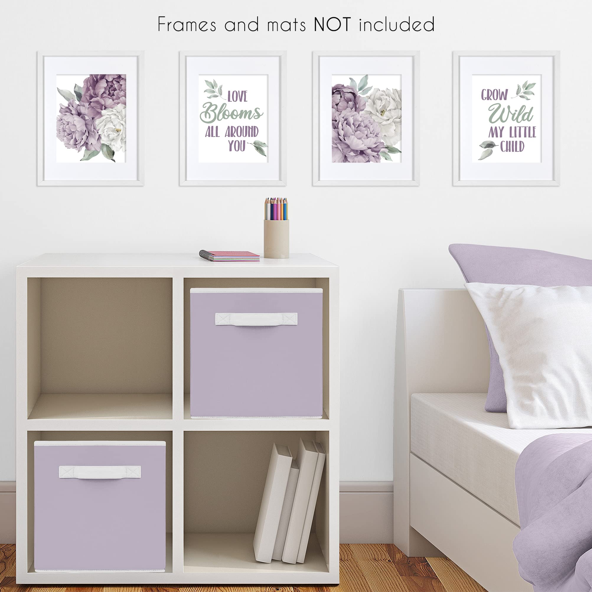 Decorative wall art print set features lavender purple and ivory boho shabby chic watercolor floral bohemian vintage garden peony flowers with inspirational "Love Blooms All Around You" and "Grow Wild My Little Child" quotes.
