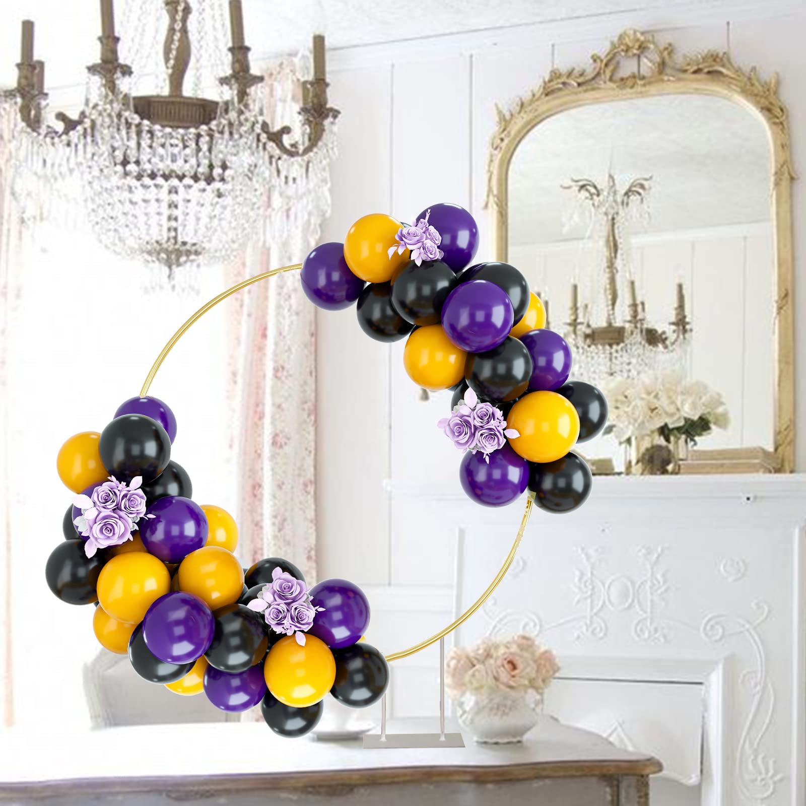 50PCS Black Purple Yellow Balloon Arch: include 15*10 inch black, 20*10 inch purple, 15*10 inch lemon yellow, 1 * balloon chain, 1 * ribbon. Our balloons can be used to DIY hula hoop balloon garlands and then used to decorate dessert tables, or can be hung on the wall for decoration, or used as photo props.