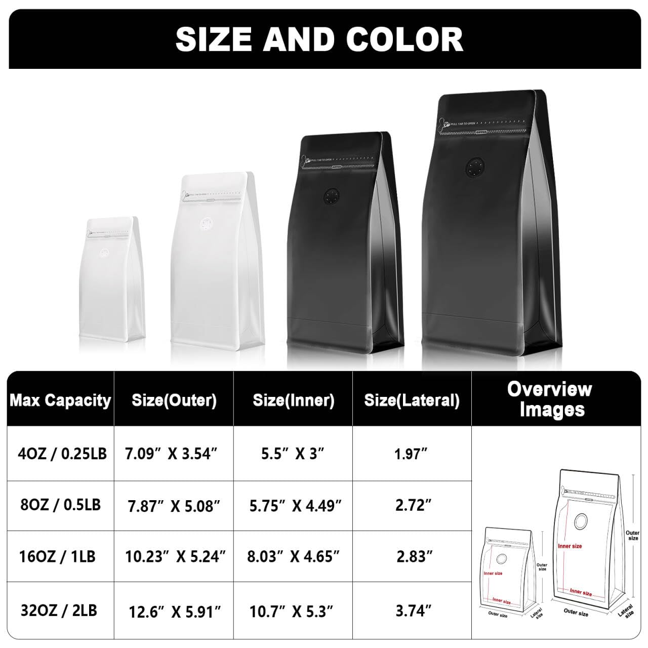 Size:[3.54×7.1+3inch (9cmX18cm+5cm),volume of 4oz/0.25lb/100g, aluminum foil flat bottom reusable side zipper coffee bags with one-way air valve,one-sided thickness of 0.15mm.]